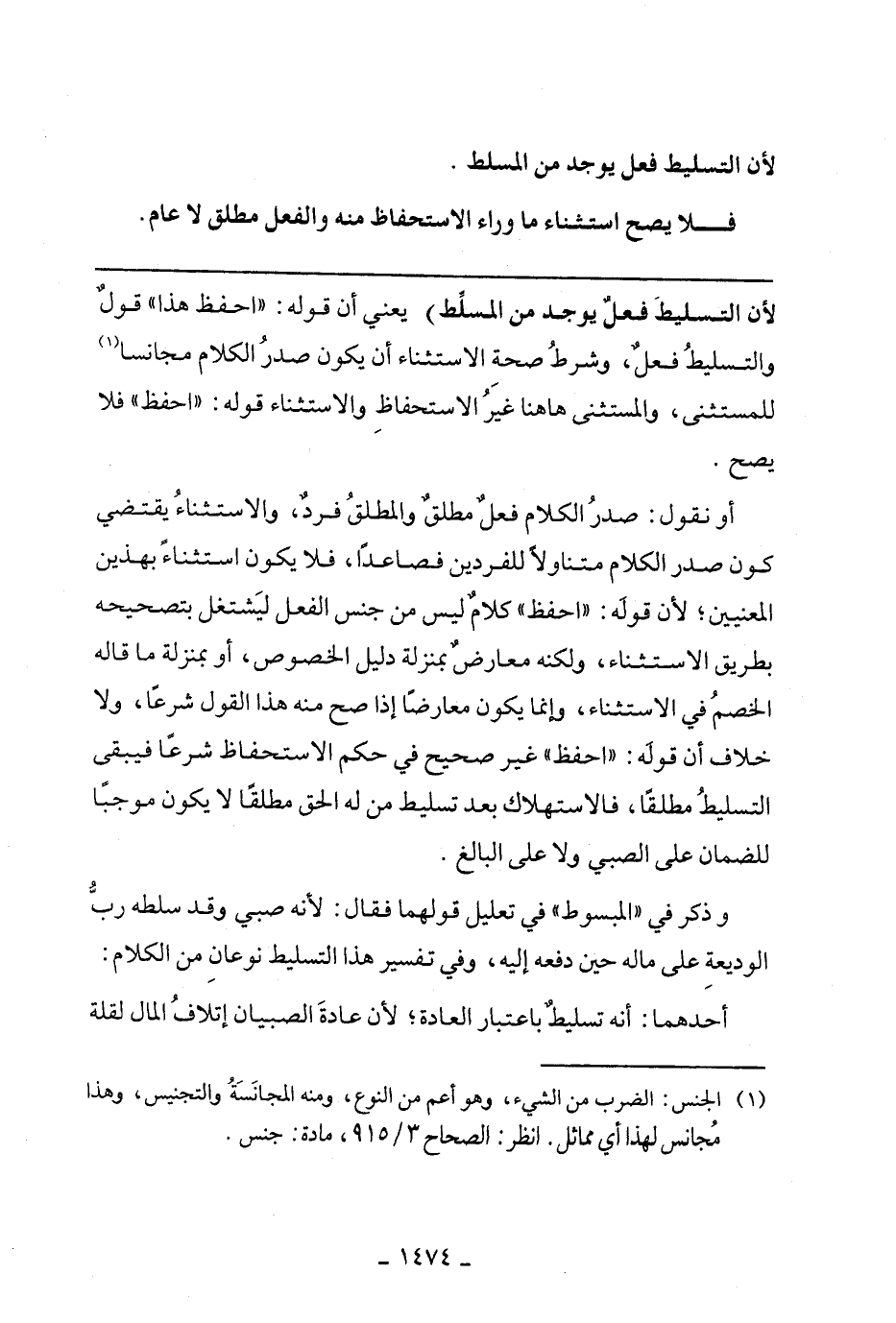 لأن التسليط فعل يوجد من المسلط) يعني أن قوله: "احفظ هذا" قول والتسليط فعل، وشرط صحة الاستثناء أن يكون صدر الكلام مجانسا للمستثنى، والمستثنى هاهنا غير الاستحفاظ والإستثماء قوله: "احفظ" فلا يصح.