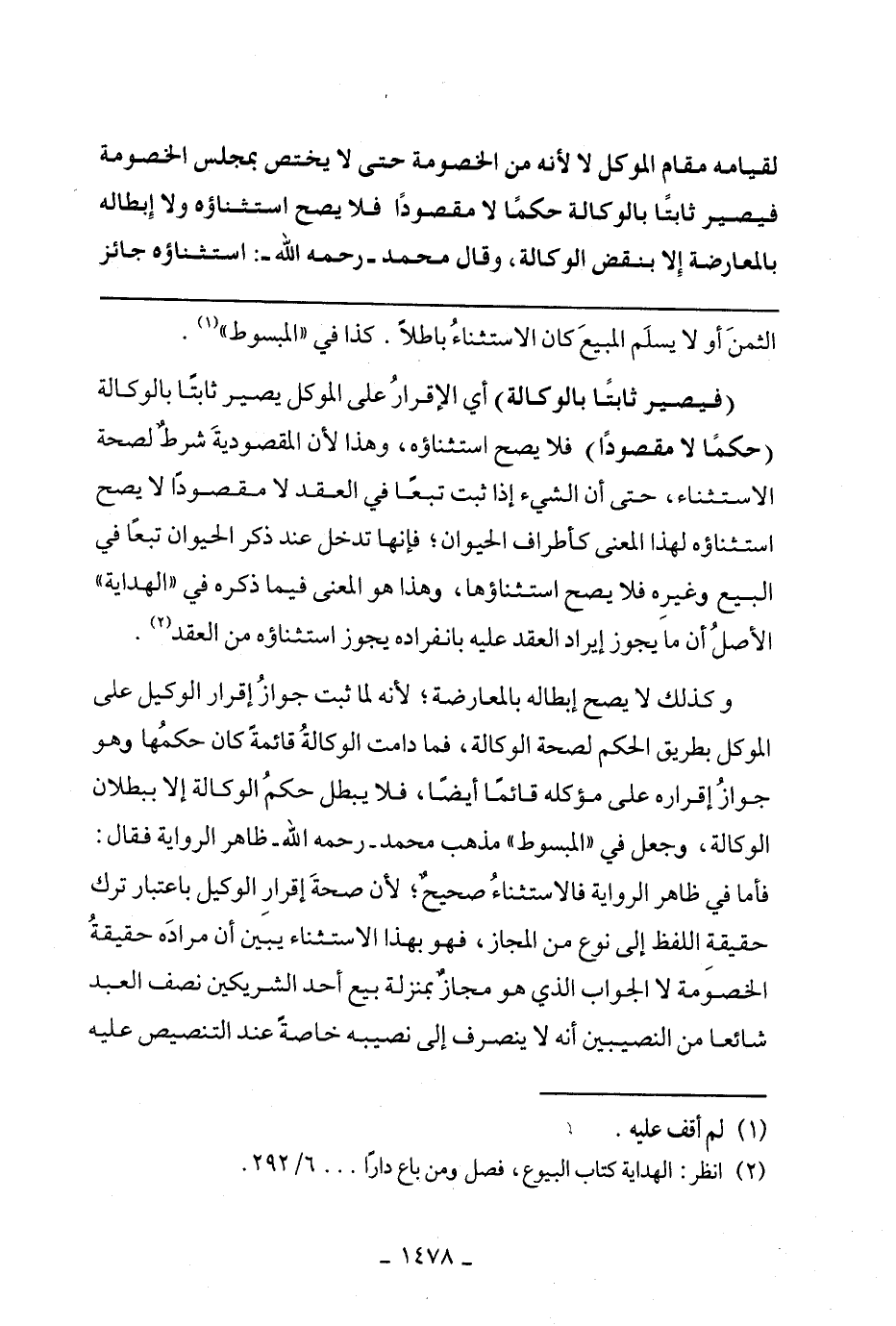 وكذلك لا يصح إبطاله بالمعارضة؛ لأنه لما ثبت جواز إقرار الوكيل على الموكل بطريق الحكم لصحة الوكالة، فما دامت الوكالة قائمة كان حكمها وهو جواز إقراره على موكله قائما أيضا، فلا يبطل حكم الوكالة إلا ببطلان الوكالة، وجعل في "المبسوط" مذهب محمد -رحمه الله- ظاهر الرواية فقال: فأما في ظاهر الرواية فالاستثناء صحيح؛ لأن صحة إقرار الوكيل باعتبار ترك حقيقة اللفظ إلى نوع من المجاز، فهو بهذا الاستثناء يبين أن مراده حقيقة الخصومة لا الجواب الذي هو مجاز بمنزلة بيع أحد الشريكين نصف العبد شائعا من النصيبين أنه لا ينصرف إلى نصيبه خاصة عند التنصيص عليه