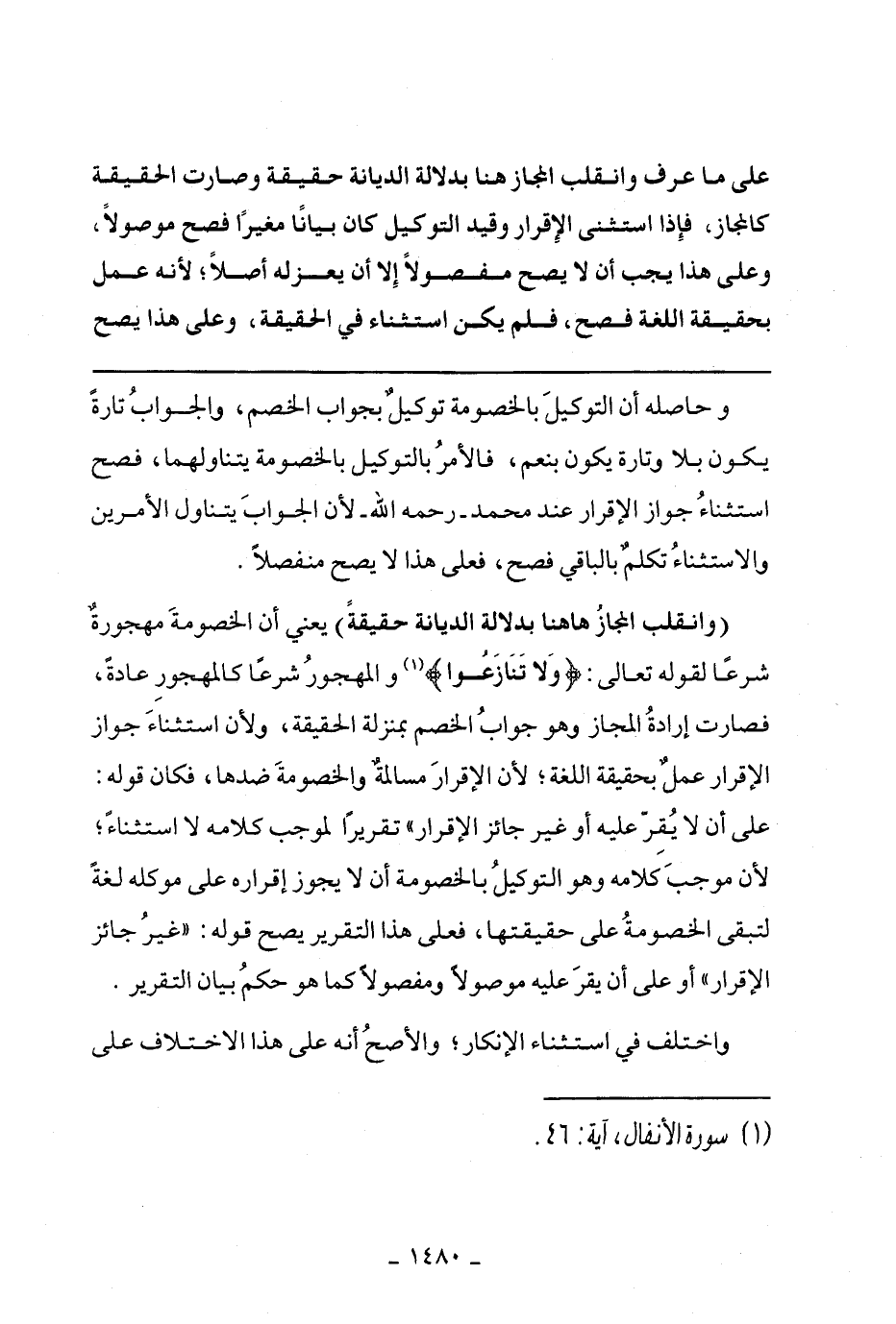 (وانقلب المجاز هاهنا بدلالة الديانة حقيقة) يعني أن الخصومة مهجورة شرعا لقوله تعالى: (وَلَا تَنَازَعُوا) والمهجور شرعا كالمهجور عادة، فصارت إرادة المجاز وهو جواب الخصم بمنزلة الحقيقة، ولأن استثناء جواز الإقرار عمل بحقيقة اللغة؛ لأن الإقرار مسالمة والخصومة ضدها، فكان قوله: على أن لا يقر عليه أو غير جائز الاقرار، تقريرا لموجب كلامه لا استثناءه؛ لأن موجب كلامه وهو التوكيل بالخصومة أن لا يجوز إقراره على موكله لغة لتبقى الخصومة على حقيقتها، فعلى هذا التقرير يصبح قوله: " غير جائز الاقرار" لا وعلى أن يقر عليه موصولا ومفصولا كما هو حكم بيان التقرير.