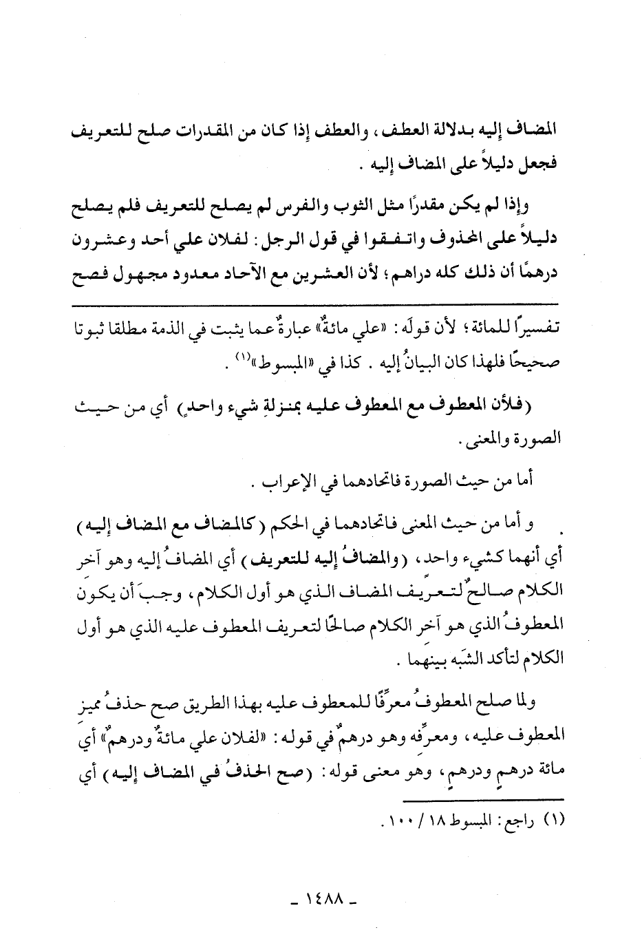 ولما صلح المعطوف معرفًا للمعطوف عليه بهذا الطريق صح حذف مميز المعطوف عليه، ومعرفه وهو درهم في قوله: "الفلان على مائة ودرهم" أي مائة درهم ودرهم، وهو معنى قوله: (صح الحذف في المضاف إليه) أي