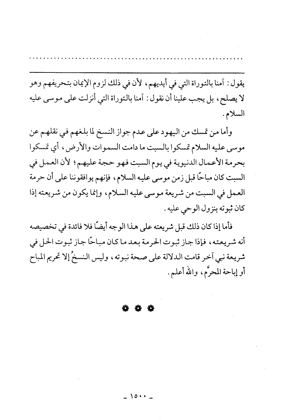 وأما من تمسك من اليهود على عدم جواز النسخ لما بلغهم في نقلهم عن موسى عليه السلام تمسكوا بالسبت ما دامت السموات والأرض، أي تمسكوا بحرمة الأعمال الدنيوية في يوم السبت فهو حجة عليهم؛ لأن العمل في السبت كان مباحًا قبل زمن موسى عليه السلام، فإنهم يوافقونا على أن حرمة العمل في السبت من شريعة موسى عليه السلام، وإنما يكون من شريعته إذا كان ثبوته بنزول الوحي عليه.