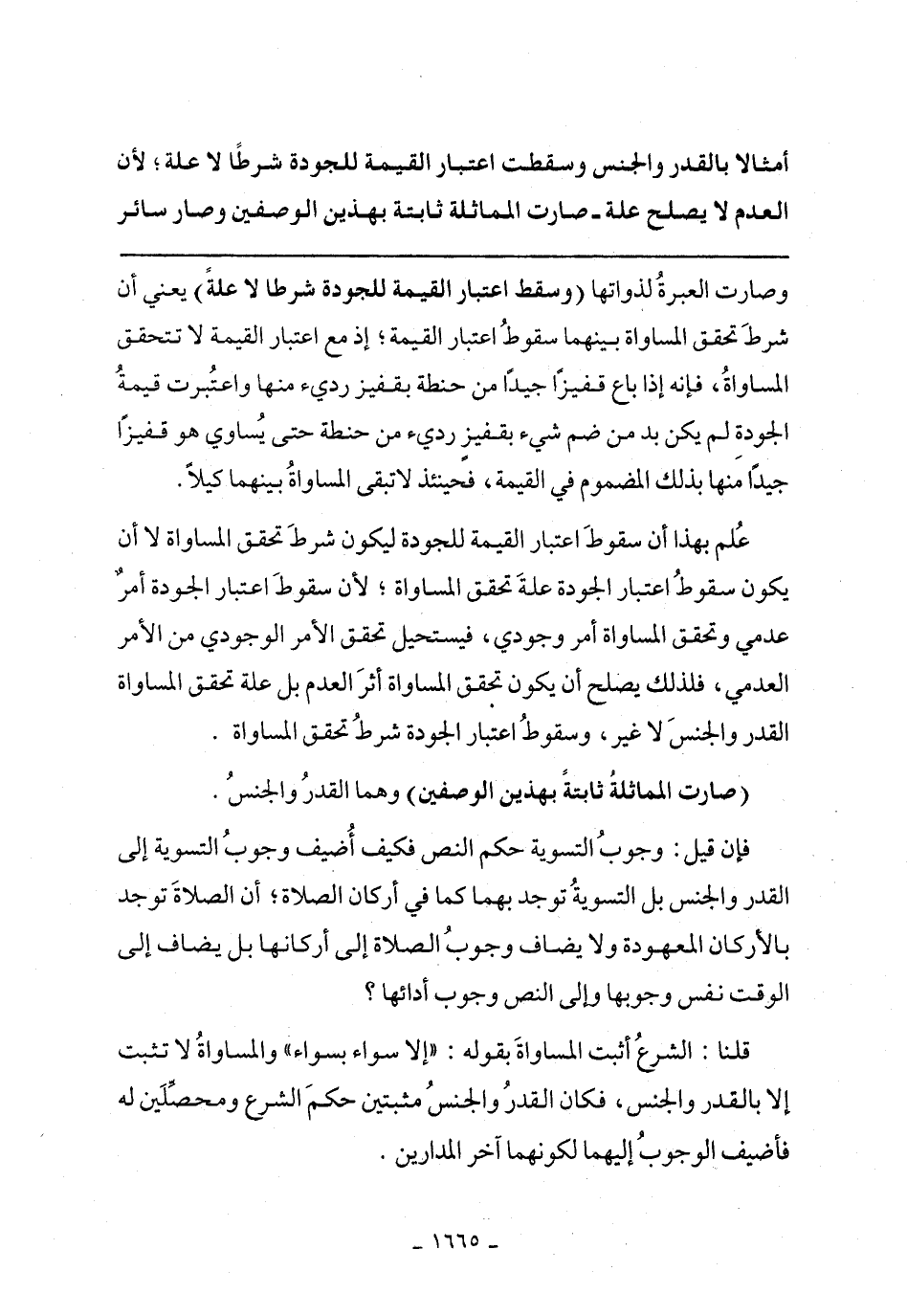 علم بهذا أن سقوط اعتبار القيمة للجودة ليكون شرط تحقق المساواة لا أن يكون سقوط اعتبار الجودة علة تحقق المساواة؛ لأن سقوط اعتبار الجودة أمر عدمي وتحقق المساواة أمر وجودي، فيستحيل تحقق الأمر الوجودي من الأمر العدمي، فلذلك يصلح أن يكون تحقق المساواة أثر العدم بل علة تحقق المساواة القدر والجنس لا غير، وسقوط اعتبار الجودة شرط تحقق المساواة.