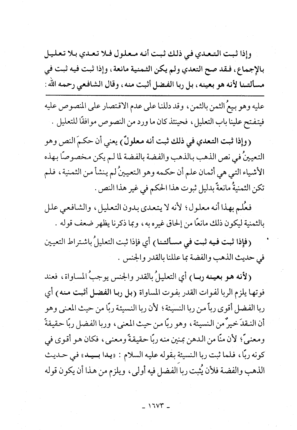 (وإذا ثبت التعدي فى ذلك ثبت أنه معلول) يعني أن حكم النص وهو التعيين في نص الذهب بالذهب والفضة بالفضة لما لم يكن مخصوصاَ بهذه الأشياء التي هي أثمان على أن حكمه وهو التعيين لم ينشأ من الثمينة, فلم تكن الثمينة مانعة بدليل ثبوت هذا الحكم في غير هذا النص.