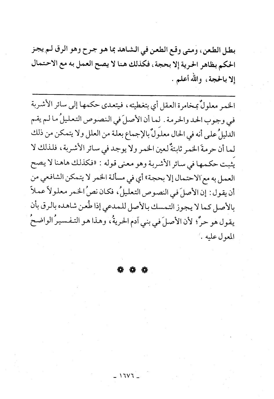 الخمر معلول بمخامرة العقل أي بتغطيه , فيتعدى حكمها إلى سائر الأشربة في وجوب الحد والحرمة. لما أن الأصل في النصوص التعليل ما لم يقم الدليل على انه في الحال معلول بالإجماع بعلة من العلل ولا يتمكن من ذلك لما أن حرمة الخمر ثابتة لعين الخمر ولا يوجد في سائر الأشربة , فلذلك لا يثبت حكمها في سائر الأشربة وهو معنى قوله: "فكذلك هاهنا لا يصح العمل به مع الاحتمال إلا بحجة" أي في مسألة الخمر لا يتمكن الشافعي من أن يقول: إن الأصل في النصوص التعليل , فكان نص الخمر معلولاَ عملاَ بالأصل كما لا يجوز التمسك بالأصل للمدعي إذا طعن شاهده بالرق بأن يقول هو حر؛ لأن الأصل في بني آدم الحرية , وهذا هو التفسير الواضح المعول عليه.