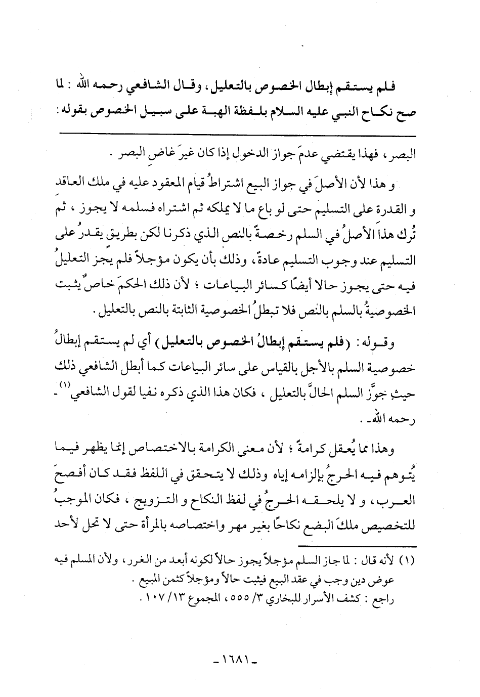 وقوله: (فلم يستقم إبطال الخصوص بالتعديل) أي لم يستقم إبطال خصوصية السلم بالأجل بالقياس على سائر البياعات كما أطبل الشافعي ذلك حيث جوز السلم الحال بالتعديل، فكان هذا الذي ذكره نفيًا لقول الشافعي -رحمه الله.