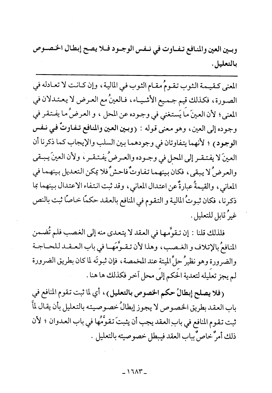 المعنى كقيمة الثوب تقوم مقام الثوب فيه المالية، وإن كانت لا تعادله في الصورة، فكذلك قيم جميع الأشياء، فالعين مع العرض لا يعتدلان في المعنى، لأن العين ما يستغني في وجوده عن المحل، والعرض ما يفتقر في وجوده إلى العين، وهو معنى قوله: (وبين العين والمنافع تفاوت في نفس الوجود)، لأنهما يتفاوتان في وجودهما بين السلب والإيجاب كما ذكرنا أن العين لا يفتقر إلى المحل في وجوده والعرض يفتقر، ولأن العين يبقى والعرض لا يبقى، فكان بينهما تفاوت فاحش فلا يمكن التعديل بينهما في المعاني، والقيمة عبارة عن اعتدال المعاني، وقد ثبت انتفاء الاعتدال بينهما بما ذكرنا، فكان ثبوت المالية والتقويم في المناع بالعقد حكمًا خاصًا ثبت بالنص غير قابل للتعديل.