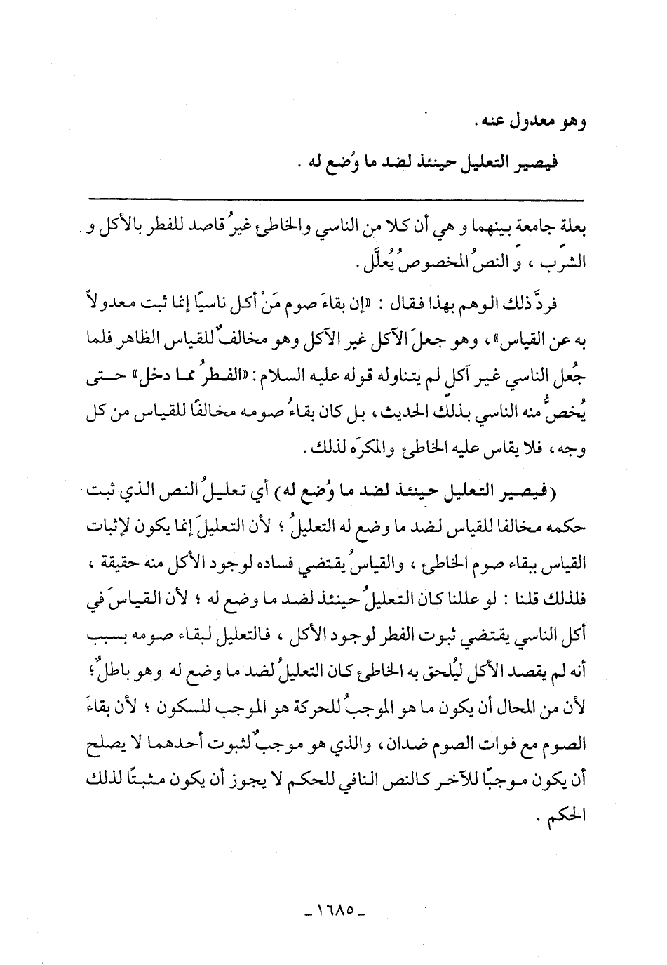 (فيصير التعليل حينئذ لضد ما وضع له) أي تعليل النص الذي ثبت حكمه مخالفًا للقياس لضد ما وضع له التعليل، لأن التعليل إنما يكون لإثبات القياس ببقاء صوم الخاطئ، والقياس يقتضي فساده لوجود الأكل منه حقيقة، فلذلك قلنا: لو عللنا كان التعليل حينئذ لضد ما وضع له، لأن القياس في أكل الناسي يقتضي ثبوت الفطر لوجود الأكل، فالتعليل لبقاء صومه بسبب أنه لم يقصد الأكل ليلحق به الخاطئ كان التعليل لضد ما وضع له وهو باطل، لأن من المحال أن يكون ما هو الموجب للحركة هو الموجب للسكون، لأن بقاء الصوم مع فوات الصوم ضدان، والذي هو موجب لثبوت أحدهما لا يصلح أن يكون موجبًا للآخر كالنص النافي للحكم لا يجوز أن يكون مثبتًا لذلك الحكم.