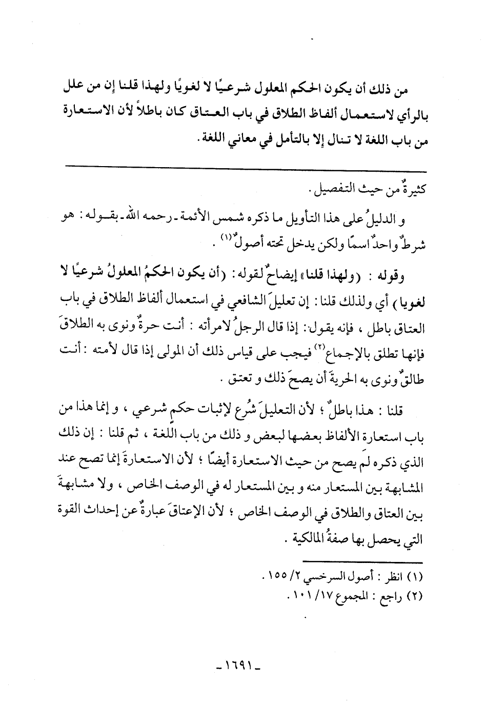 قلنا: هذا باطل، لأن التعليل شرع لإثبات حكم شرعي، وإنما هذا من باب استعارة الألفاظ بعضها لبعض وذلك من باب اللغة، ثم قلنا: إن ذلك الذي ذكره لم يصح من حيث الاستعارة أيضًا، لأن الاستعارة إنما تصح عنه المشابهة بين المستعار منه وبين المستعار له في الوصف الخاص، ولا مشابهة بين العناق والطلاق في الوصف الخاص، لأن الإعتاق عبارة عن إحداث القوة التي يحصل بها صفة المالكية.