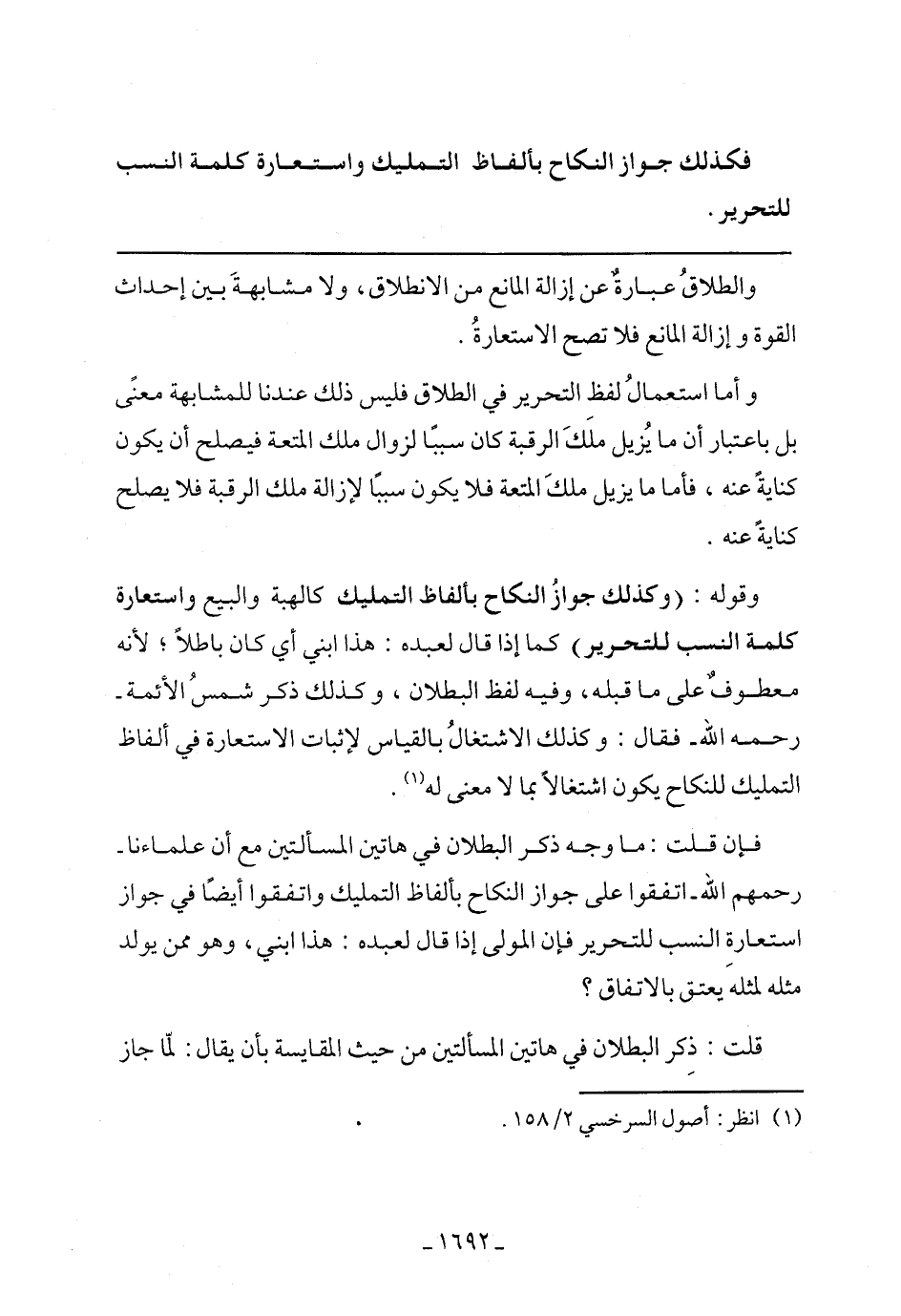 وأما استعمال لفظ التحرير في الطلاق فليس ذلك عندنا للمشابهة معنى بل باعتبار أن ما يزيل الرقبة كان سببًا لزوال ملك المتعة فلا يكون سببًا لإزالة ملك الرقبة فلا يصلح كناية عنه.