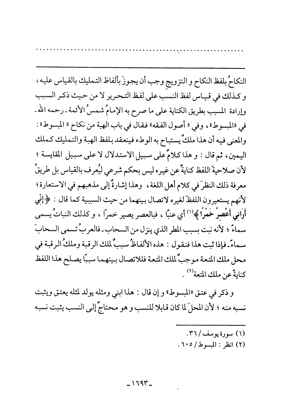 النكاح بلفظ النكاح والتزويج وجب أن يجوز بألفاظ التمليك بالقياس عليه، وكذلك في قياس لفظ النسب على لفظ التحرير لا من حيث ذكر السبب وإرادة المسبب بطريقه الكناية على ما صرح به الإمام شمس الأئمة -رحمه الله- في "المبسوط"، وقي "أصول الفقه" فقال في باب الهبة من نكاح "المبسوط": والمعنى فيه أن هذا ملك يستباح به الوطء فينعقد بلفظ الهبة والتمليك كملك اليمين، ثم قال: وهذا كلام على سبيل الاستدلال لا على سبيل المقايسة، لأن صلاحية اللفظ كناية عن غيره ليس بحكم شرعي ليعرف بالقياس بل طريق معرفة ذلك النظر في كلام أهل اللغة، وهذا إشارة إلى مذهبهم في الاستعارة، لأنهم يستعيرون اللفظ لغيره لاتصال بينهما من حيث السببية كما قال: (إني أراني أعصر خمرا) أي عنبًا، فبالعصر يصير خمرًا، وكذلك النبات يسمى سماء، لأنه نبت بسبب المطر الذي ينزل من السحاب- فالعرب تسمى السحاب سماءً- فإذا ثبت هذا فنقول: هذه الألفاظ سبب لملك الرقبة وملك الرقبة في محل ملك المتعة موجب لملك المتعة فللاتصال بينهما سببًا يصلح هذا اللفظ كناية عن ملك المتعة.