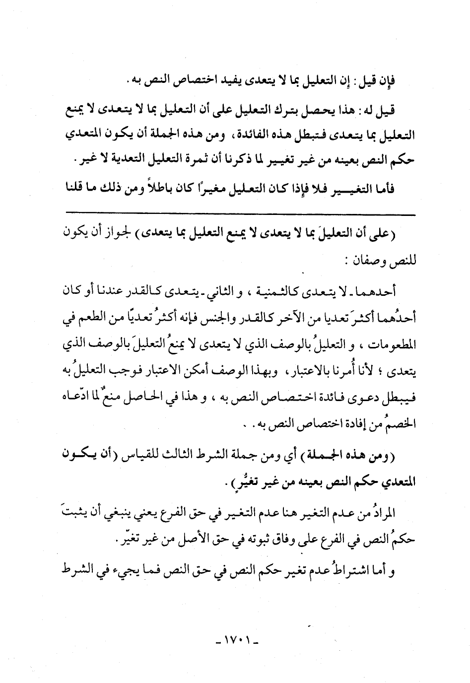 أحدهما- لا يتعدى كالثمنية، والثاني- يتعدى كالقدر عندنا أو كان أحدهما أكثر تعديًا من الآخر كالقدر والجنس فإنه أكثر تعديًا من الطعم في المطعومات، والتعليل بالوصف الذي لا يتعدى لا يمنع التعليل بالوصف الذي يتعدى، لأنا أمرنا بالاعتبار، وبهذا الوصف أمكن الاعتبار فوجب التعليل به فيبطل دعوى فائدة اختصاص النص به، وهذا في الحاصل منع لما ادعاه الخصم من إفادة اختصاص النص به.
