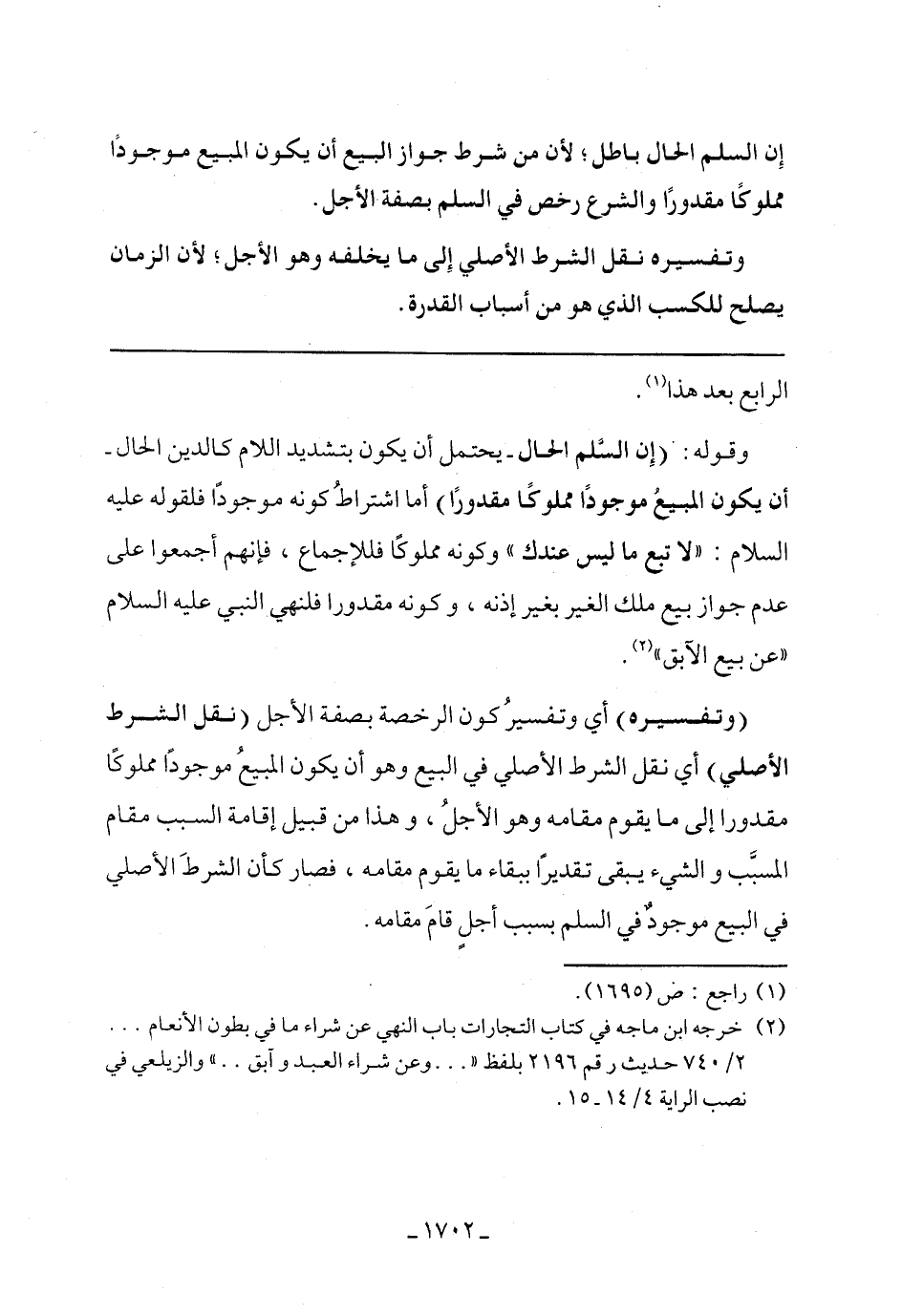 وقوله: (إن السلم الحال- يحتمل أن يكون بتشديد اللام كالدين الحال- أن يكون المبيع موجودًا مملوكًا مقدورًا) أما اشتراط كونه موجودًا فلقوله عليه السلام: "لا تبع ما ليس عندك" وكونه مملوكًا فللإجماع، فإنهم أجمعوا على عدم جواز بيع ملك الغير بغير إذنه، وكونه مقدورا فلنهي النبي عليه السلام "عن بيع الآبق".
