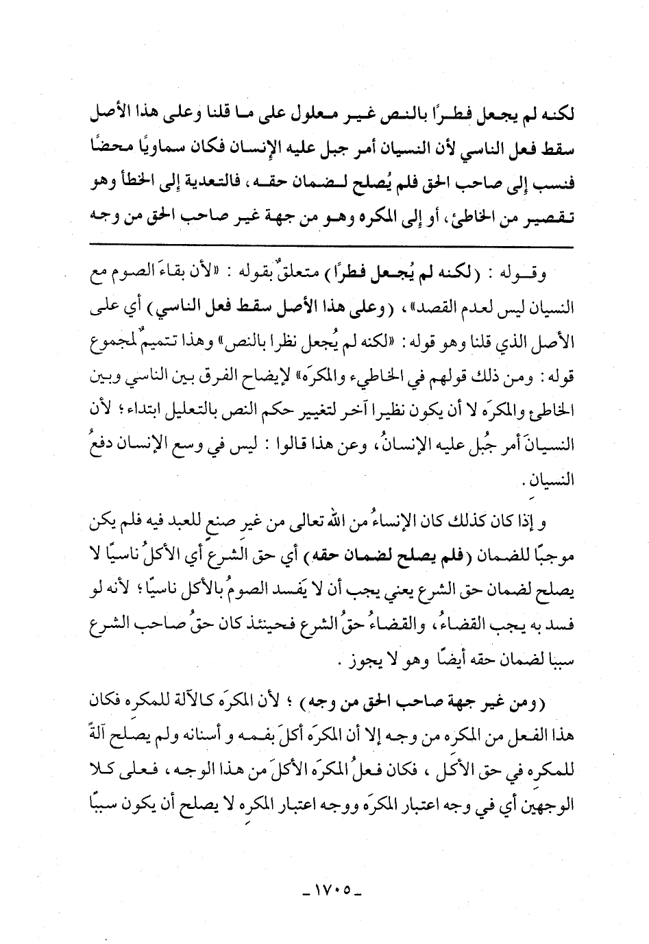 وقوله: (لكنه لم يجعل فطرًا) متعلق بقوله: "لأن بقاء الصوم مع النسيان ليس لعدم القصد"، (وعلى هذا الأصل سقط فعل الناسي) أي على الأصل الذي قلنا وهو قوله: "لكنه لم يجعل نظرًا بالنص" وهذا تتميم لمجموع قوله: ومن ذلك قولهم في الخاطئ والمكره" لإيضاح الفرق بين الناسي وبين الخاطئ والمكره لا أن يكون نظيرا آخر لتغيير حكم النص بالتعليل ابتداء، لأن النسيان أمر جبل عليه الإنسان، وعن هذا قالوا: ليس في وسع الإنسان دفع النسيان.