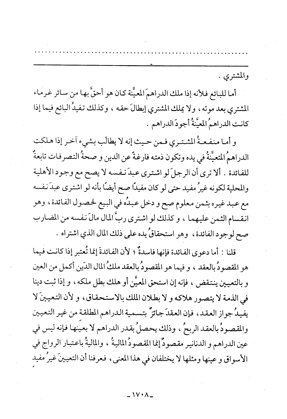وأما منفعة المشتري فمن حيث إنه لا يطالب بشيء آخر إذا هلكت الدراهم المتعينة في يده وتكون ذمته فارغة عن الدين وصحة التصرفات تابعة للفائدة. ألا ترى أن الرجل لو اشترى عبد نفسه لا يصح مع وجود الأهلية والمحلية لكونه غير مفيد حتى لو كان مفيدًا صح أيضًا بأنه لو اشترى عبد نفسه مع عبد غيره بثمن معلوم صح ودخل عبده في البيع لحصول الفائدة، وهو انقسام الثمن عليهما، وكذلك لو اشترى رب المال مال نفسه من المضارب صح لوجود الفائدة، وهو استحقاق يده على ذلك المال الذى اشتراه.