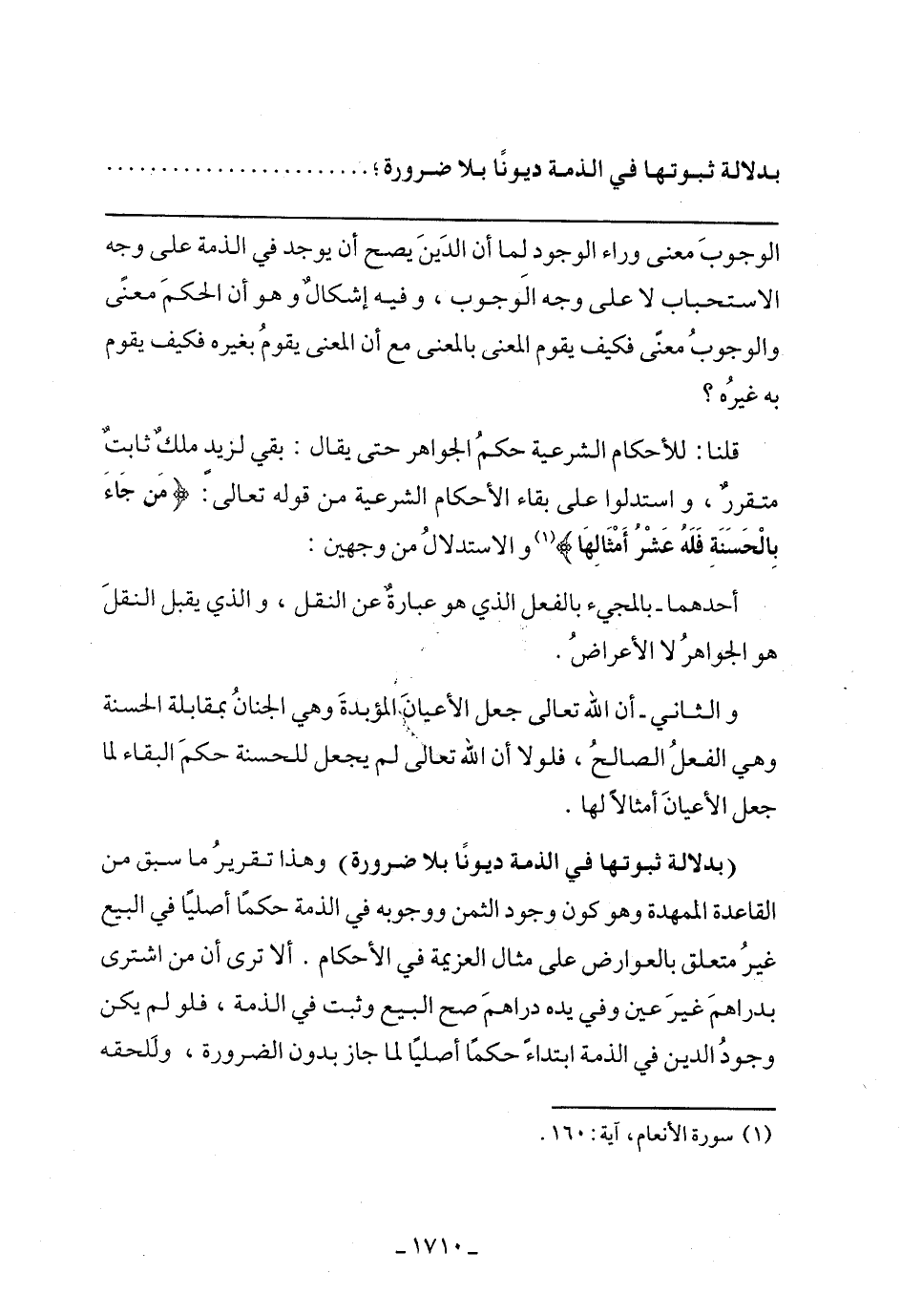 (بدلالة ثبوتها في الذمة ديونًا بلا ضرورة) وهذا تقرير ما سبق من القاعدة الممهدة وهو كون وجود الثمن ووجوبه فى الذمة حكمًا أصليًا في البيع غير متعلق بالعوارض على مثال العزيمة في الأحكام. ألا ترى أن من اشترى بدراهم غير عين وفي يده دراهم صح البيع وثبت في الذمة، فلو لم يكن وجود الدين في الذمة ابتداءً حكمًا أصليًا لما جاز بدون الضرورة، ولحقه