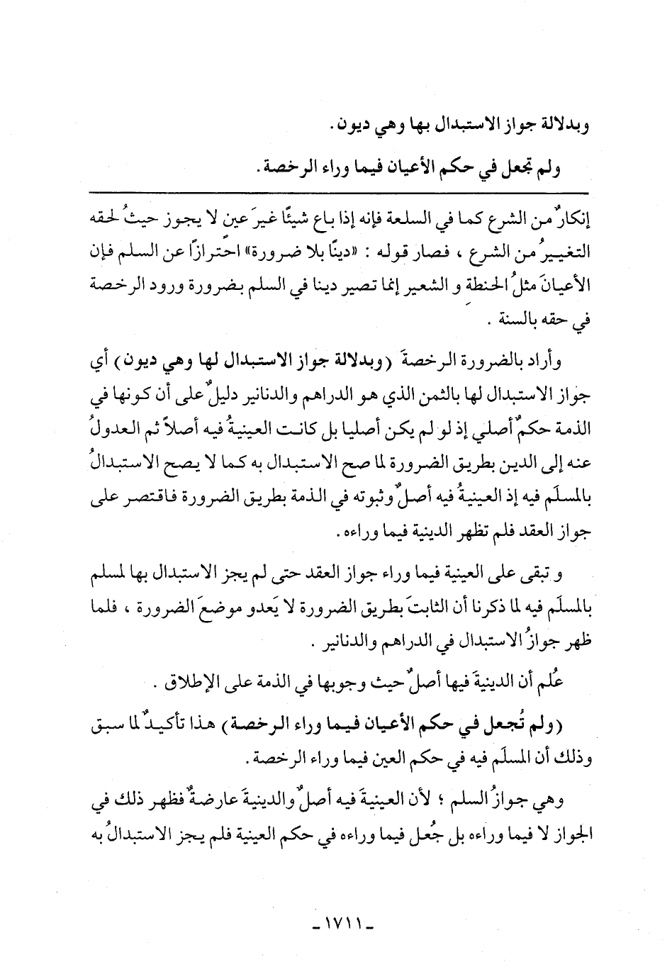 وأراد بالضرورة الرخصة (وبدلالة جواز الاستبدال لها وهي ديون) أي جواز الاستبدال لها بالثمن الذى هو الدراهم والدنانير دليل على أن كونها في الذمة حكم أصلي إذ لو يكن أصليًا بل كانت العينية فيه أصلًا ثم العدول عنه إلى الدين بطريق الضرورة لما صح الاستبدال به كما لا يصح الاستبدال بالمسلم فيه إذا العينية فيه أصل وثبوته في الذمة بطريق الضرورة فاقتصر على جواز العقد فلم تظهر الدينية فيما وراءه.