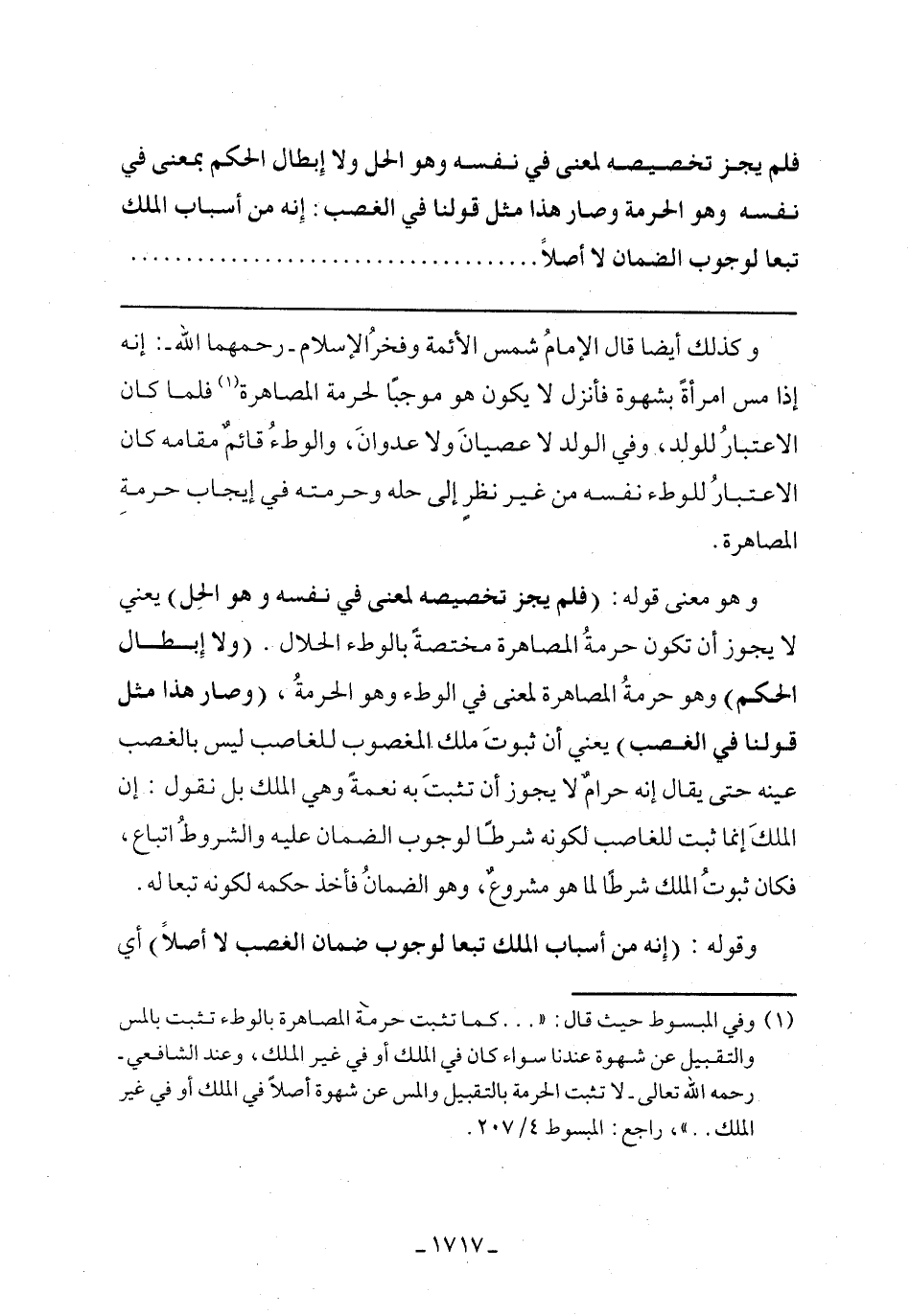 وهو معنى قوله: (فلم يجز تخصيه لمعني في نفسه وهو الحل) يعني لا يجوز أن تكون حرمة المصاهرة مختصة بالوطء الحلال. (ولا إبطال الحكم) وهو حرمة المصاهرة لمعنى في الوطء وهو الحرمة، (وصار هذا مثل قولنا في الغصب) يعني أن ثبوت ملك المغصوب للغاصب ليس بالغصب عينه حتى يقال إنه حرام لا يجوز أن تثبت به نعمة وهي الملك بل نقول: إن الملك إنما ثبت للغاصب لكونه شرطًا لوجوب الضمان عليه والشروط اتباع، فكان ثبوت الملك شرطًا لما هو مشروع، وهو الضمان فأخذ حكمه لكونه تبعًا له.