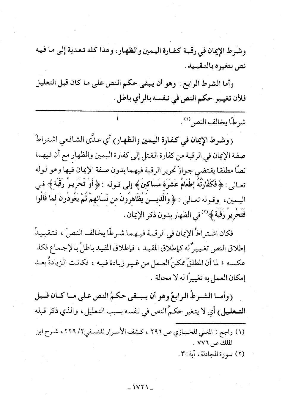(وشرط الإيمان في كفارة اليمين والظهار) أي عدى الشافعي اشتراط صفة الإيمان في الرقبة من كفارة القتل إلى كفارة اليمين والظهار مع أن فيهما نصًا مطلقًا يقتضي جواز تحرير الرقبة فيهما بدون صفة الإيمان فيها وهو قوله تعالى: (فَكَفَّارَتُهُ إطْعَامُ عَشَرَةِ مَسَاكِينَ) إلى قوله: (أَوْ تَحْرِيرُ رَقَبَةٍ) في اليمين، وقوله تعالى: (والَّذِينَ يُظَاهِرُونَ مِن نِّسَائِهِمْ ثُمَّ يَعُودُونَ لِمَا قَالُوا فَتَحْرِيرُ رَقَبَةٍ) في الظهار بدون ذكر الإيمان.