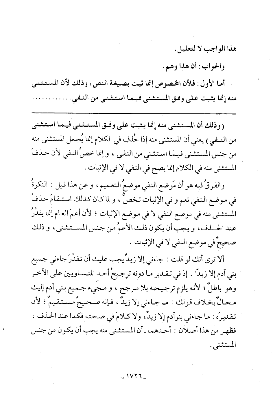 ألا ترى أنك لو قلت: جاءني إلا زيد يجب عليك أن تقدر جاءني جميع بني آدم إلا زيدًا. إذ في تقدير ما دونه ترجيح أحد المتساويين على الآخر وهو باطل، لأنه يلزم ترجيحه بلا مرجح، ومجيء جميع بنى آدم إليك محال بخلاف قولك: ما جاءني إلا زيد، فإنه صحيح مستقيم، لأن تقديره: ما جاءني بنو آدم إلا زيد، ولا كلام في صحته فكذا عند الخلف، فظهر من هذا أصلًا: أحدهما- أن المستثني منه يجب أن يكون من جنس المستثنى.