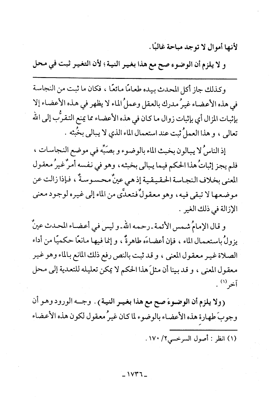 وقال الإمام شمس الأئمة -رحمه الله- وليس في أعضاء المحدث عين يزول باستعمال الماء، فإن أعضاءه طاهرة، وإنما فيها مانعًا حكميًا من أداء الصلاة غير معقول المعني، وقد ثبت بالنص رفع ذلك المانع بالماء وهو غير معقول المعني، وقد بينا أن مثل هذا الحكم لا يمكن تعليله للتعدية إلى محل آخر.