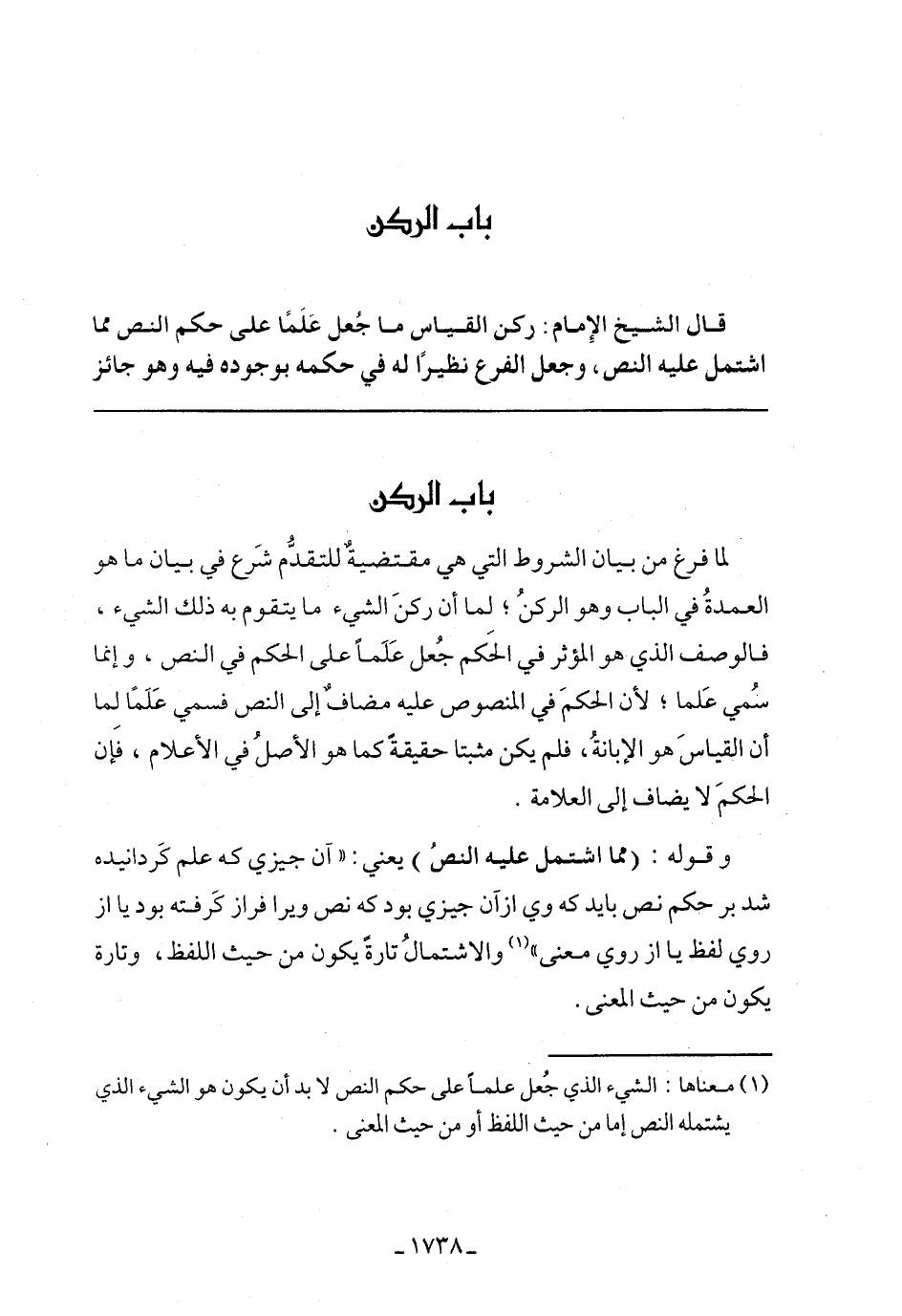 لما فرغ من بيان الشروط التي هي مقتضية للتقدم شرع في بيان ما هو العمدة في الباب وهو الركن، لما أن ركن الشيء ما يتقوم به ذلك الشيء، فالوصف الذي هو المؤثر في الحكم جعل علمًا على الحكم في النص، وإنما سمي عليما، لأن الحكم في المنصوص عليه مضاف إلى النص فسمي علمًا لما أن القياس هو الإبانة، فلم يكن مثبتًا حقيقة كما هو الأصل في الأعلام، فإن الحكم لا يضاف إلى العلامة.