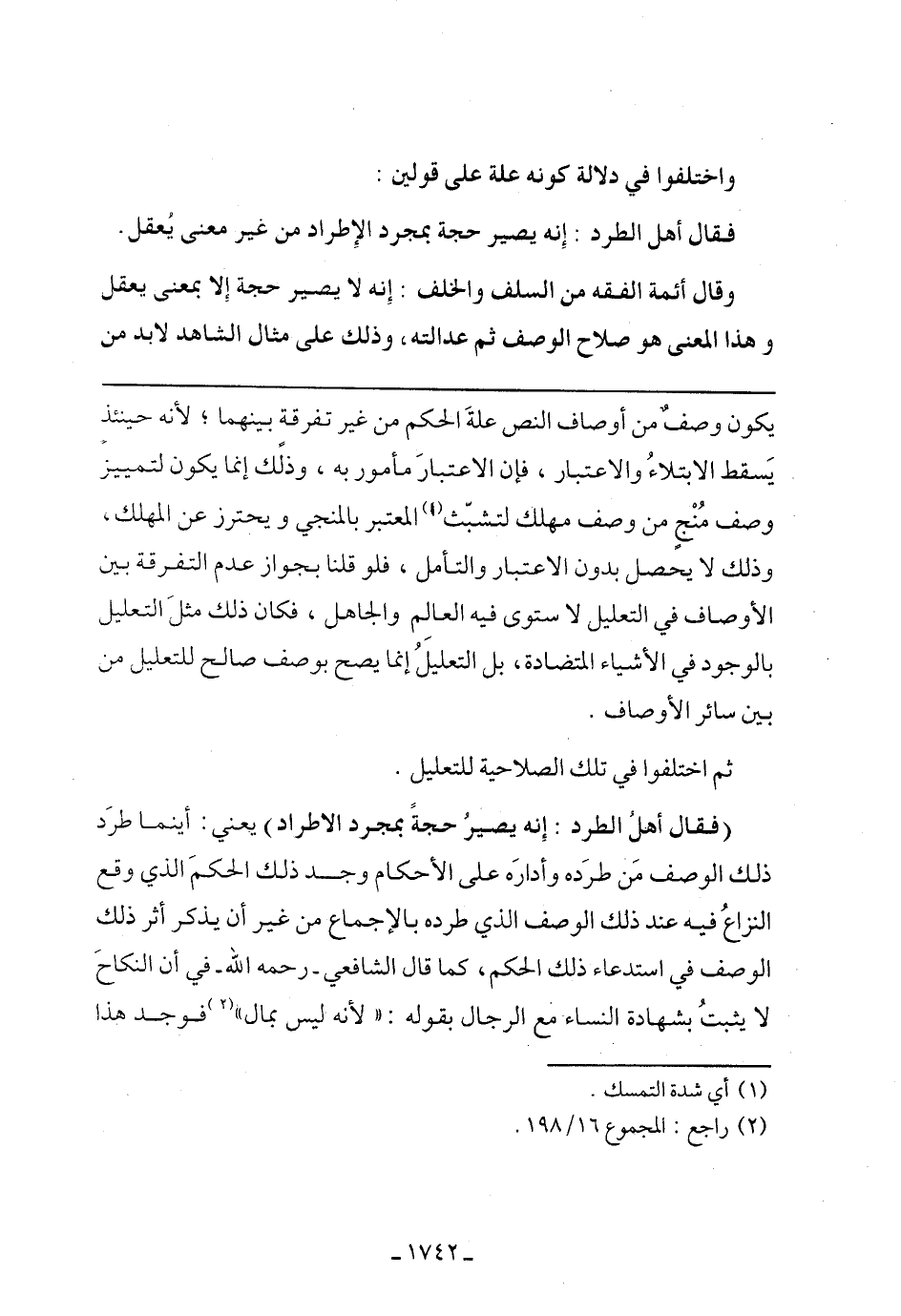 (فقال أهل الطرد: إنه يصير حجة بمجرد الاطراد) يعني: أينما طرد ذلك الوصف من طرده وأداره على الأحكام وجد ذلك الحكم الذي وقع النزاع فيه عند ذلك الوصف الذي طرده بالإجماع من غير أن يذكر اثر ذلك الوصف في استدعاء ذلك الحكم، كما قال الشافعي -رحمه الله- في أن النكاح لا يثبت بشهادة النساء مع الرجال بقوله: "لأنه ليس بمال" فوجد هذا