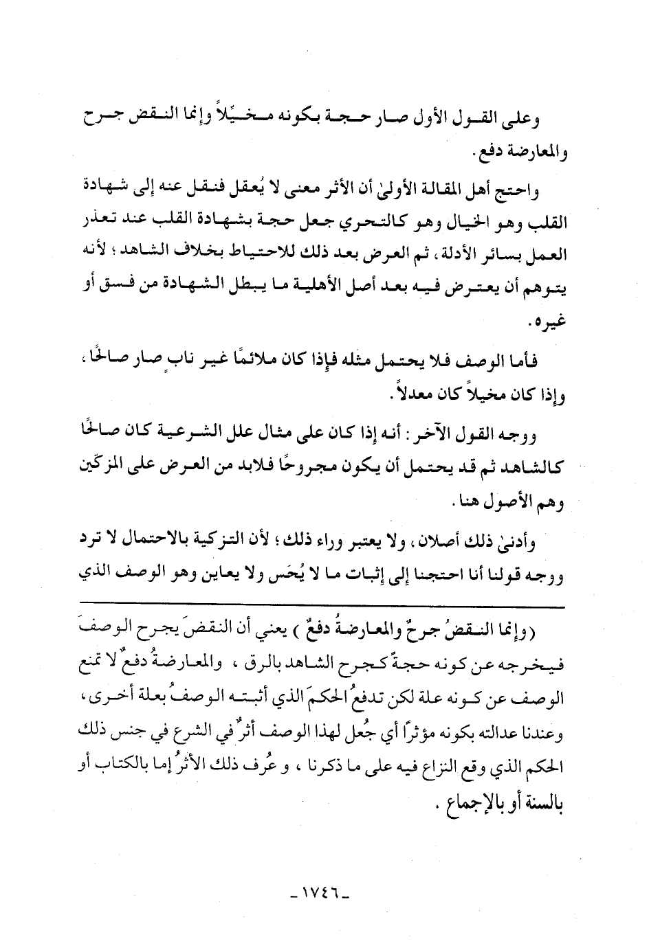 (وإنما النقض جرح والمعارضة دفع) يعني أن النقض يجرح الوصف فخرجه عن كونه حجة كجرح الشاهد بالرق، والمعارضة دفع لا تمنع الوصف عن كونه علة لكن تدفع الحكم الذي أثبته الوصف بعلة أخرى، وعندنا عدالته بكونه مؤثرًا أي جعل لهذا الوصف أثر في الشرع في جنس ذلك الحكم الذي وقع النزاع فيه على ما ذكرنا، وعرف ذلك الأثر إما بالكتاب أو بالسنة أو بالإجماع.