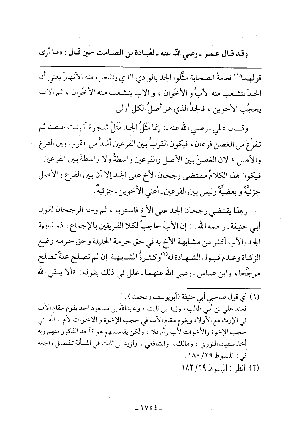 وقال علي -رضي الله عنه-: إنما مثل الجد مثل شجرة أنبتت غصنا ثم نفرع من الغصن فرعان، فيكون القرب بين الفرعين أشد من القرب بين الفرع والأصل، لأن الغصب بين الأصل والفرعين واسطة ولا واسطة بين الفرعين. فيكون هذا الكلام مقتضى رجحان الأخ على الجد إلا أن بين الفرع والأصل جزئية وبعضية وليس بين الفرعين -أعني الأخوين- جزئية.