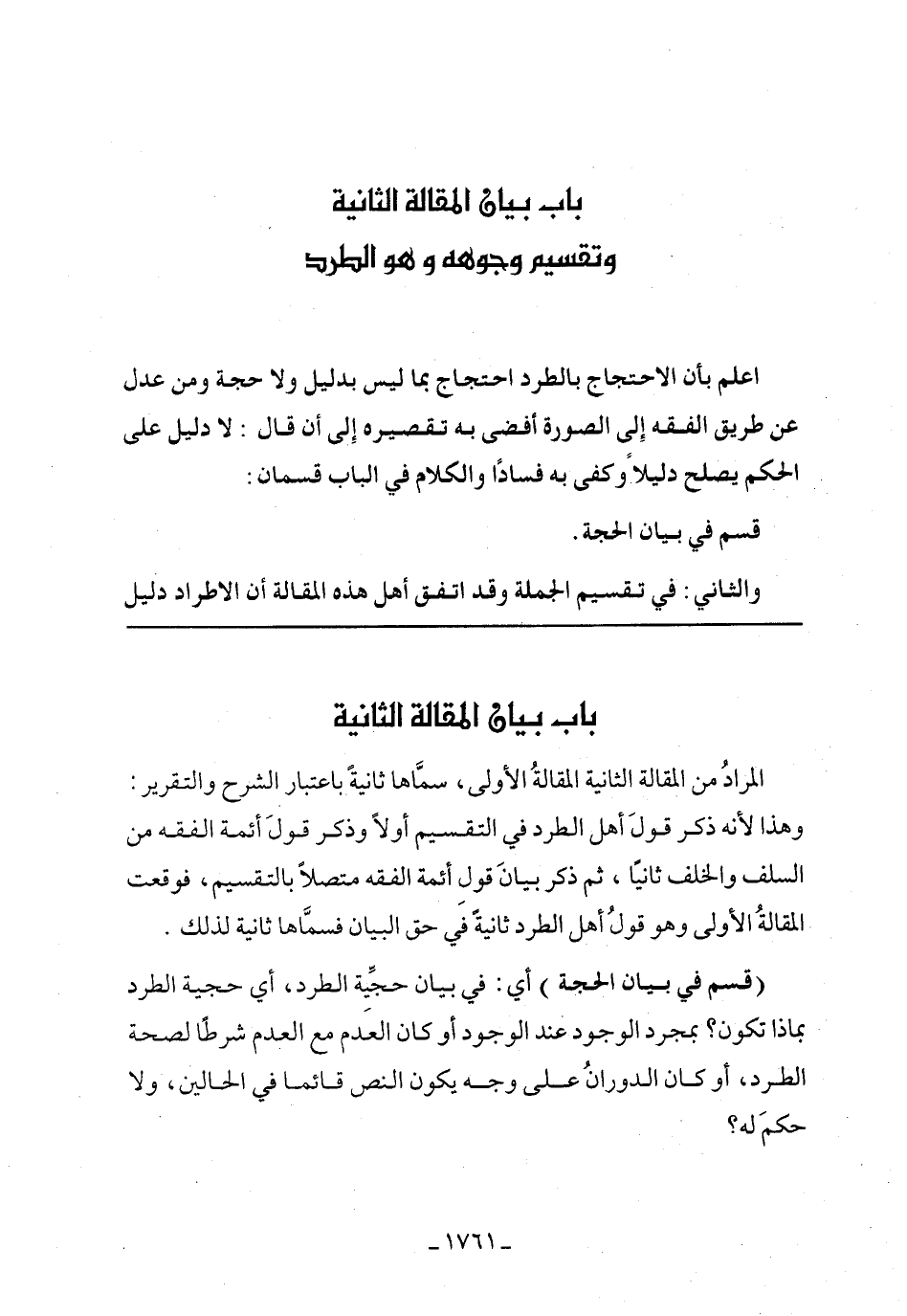 المراد من المقالة الثانية الأولى، سماها ثانية باعتبار الشرح والتقرير: وهذا لأنه ذكر قول أهل الطرد في التقسيم أولًا وذكر قول أئمة الفقه من السلف والخلف ثانيًا، ثم ذكر بيان قول أئمة الفقه متصلًا بالتقسيم، فوقعت المقالة الأولي وهو قول أهل الطرد ثانية في حق البيان فسماها ثانية لذلك.