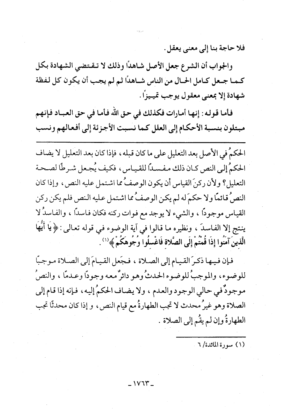 فإن فيها ذكر القيام إلى الصلاة، فجعل القيام إلى الصلاة موجبًا للوضوء، والموجب للوضوء الحدث وهو دائر معه وجودًا وعدمًا، والنص موجود في حالي الوجود والعدم، ولا يضاف الحكم إليه، فإنه إذا قام إلى الصلاة وهو غير محدث لا تجب الطهارة مع قيام النص، وإذا كان محدثًا تجب الطهارة وإن لم يقم إلى الصلاة.