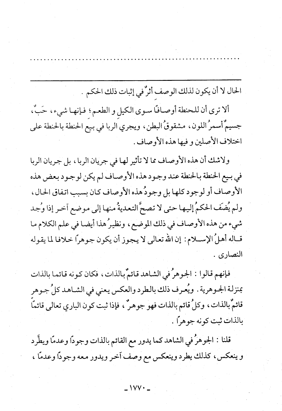 ولا شك أن هذه الأوصاف مما لا تأثير لها في جريان الربا، بل جريان الربا في بيع الحنطة بالحنطة عند وجود هذه الأوصاف لم يكن لوجود بعض هذه الأوصاف أو لوجود كلها بل وجود هذه الأوصاف كان بسبب اتفاق الحال، ولم يضف الحكم غليها حتى لا تصلح التعدية منها إلى موضع آخر إذا وجد شيء من هذه الأوصاف في ذلك الموضع، ونظير هذا أيضًا في علم الكلام ما قاله أهل الإسلام: إن الله تعالى لا يجوز أن يكون جوهرًا خلافًا لما يقوله النصارى.