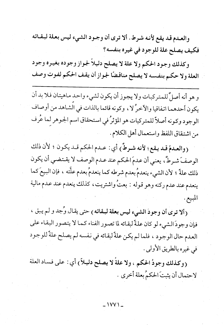 (ألا ترى أن وجود الشيء ليس بعلة لبقائه) حتى يقال وجد ولم يبق، فإن وجود الشيء لو كان علة لبقائه لما تصور الفناء كما لا يتصور البقاء على العدل حال الوجود، فلما لم يكن علة لبقائه في نفسه لم يصلح عالة للوجود في غيره بالطريق الأولي.