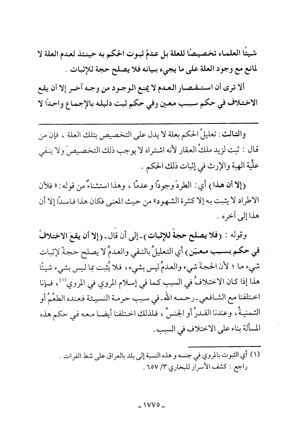 وقوله: (فلا يصلح حجة للإثبات) -إلى أن قال- (إلا أن يقع الاختلاف في حكم بسبب معين) أي التعليل بالنفي والعدم لا يصح حجة لإثبات شيء ما كان الاختلاف في السبب كما في إسلام المروي في المروي، فأنا اختلفنا مع الشافعي -رحمه الله- في سبب حرمة النسيئة فعنده الطم أو الثمنية، وعندنا القدر أو الجنسِ، فلذلك اختلفنا أيضًا معه في حكم هذه المسألة بناء على الاختلاف في السبب.