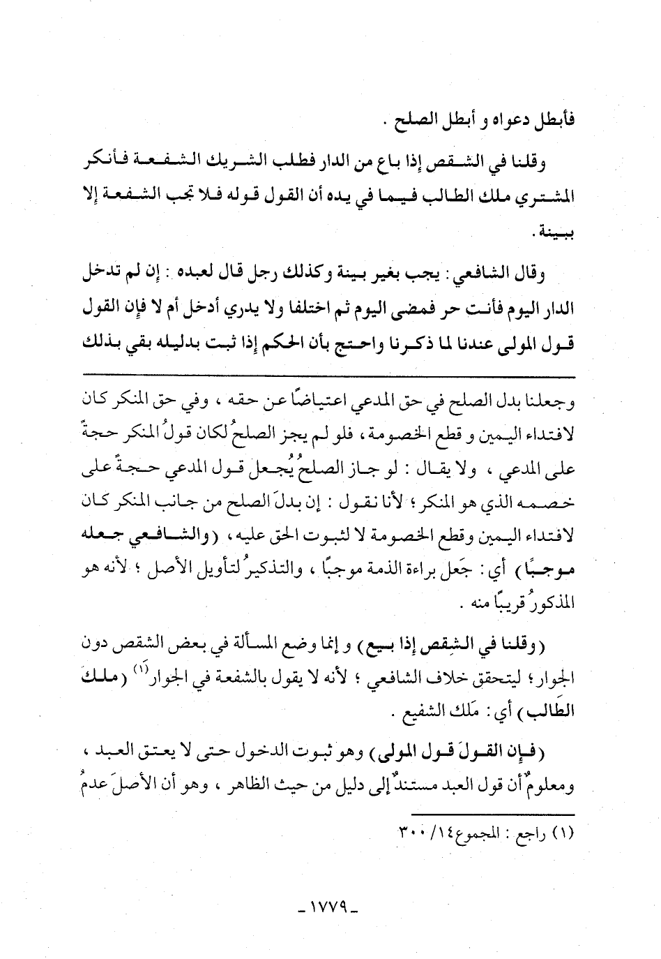 وجعلنا بدل الصلح في حق المدعي اعتياضًا عن حقه، وفي حق المنكر كان لافتداء اليمين وقطع الخصومة، فلو لم يجز الصلح لكان قول المنكر حجة على المدعي، ولا يقال: لو جاز الصلح يجعل قول المدعي حجة على خصمه الذي هو المنكر؛ لأنا نقول: إن بدل الصلح من جانب المنكر كان لافتداء اليمين وقطع الخصومة لا لثبوت الحق عليه، (والشافعي جعله موجبًا) أي: جعل براءة الذمة موجبًا، والتذكير لتأويل الأصل، لأنه هو المذكور قريبًا منه.