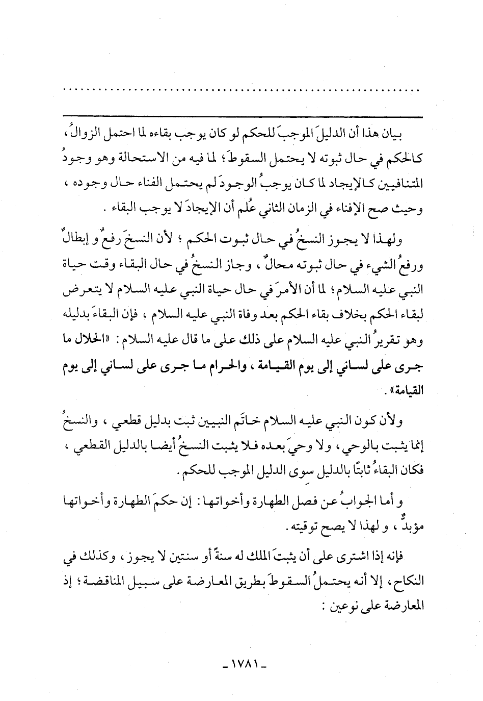 ولهذا لايجوز النسخ في حال ثبوت الحكم؛ لأن النسخ رفع وإبطال ورفع الشيء في حال ثبوته محال، وجاز النسخ في حال البقاء وقت حياة النبي عليه السلام؛ لما أن الأمر في حال حياة النبي عليه السلام، فإن البقاء بدليله وهو تقرير النبي عليه السلام على ذلك على ماقال عليه السلام: "الحلال ماجرى على لساني إلى يوم القيامة، والحرام ماجرى على لساني إلى يوم القيامة".