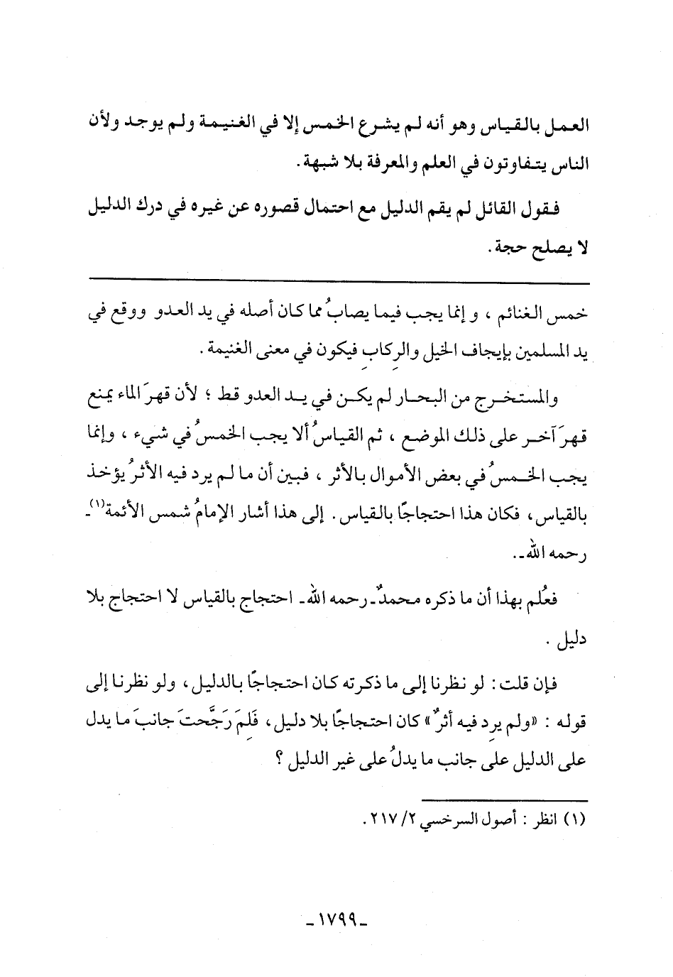 والمستخرج من البحار لم يكن في يد العدو قط؛ لأن قهر الماء يمنع قهر آخر على ذلك الموضع، ثم القياس ألا يجب الخمس في شيء، وإنما يجب الخمس في بعض الأموال بالأثر، فبين أن ما لم يرد فيه الأثر يؤخذ بالقياس، فكان هذا احتجاجا بالقياس، إلى هذا أشار الإمام شمس الأئمة -رحمه الله-.