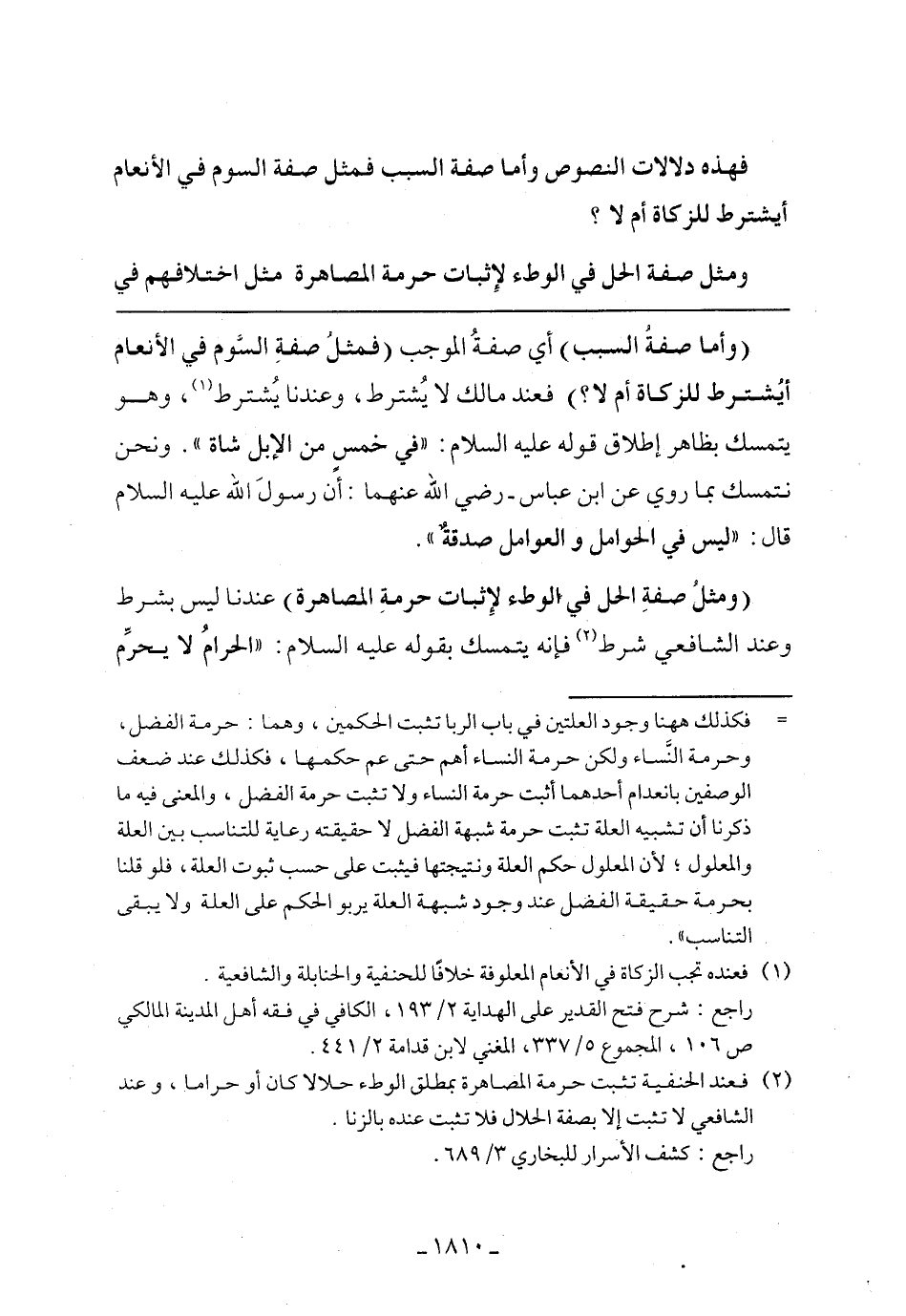 (وأما صفة السبب) أي صفة الموجب (فمثل صفة السوم في الأنعام أيشترط للزكاة أم لا؟) فعند مالك لا يشترط، وعندنا يشترط، وهو يتمسك بظاهر إطلاق قوله عليه السلام: ((في خمس من الإبل شاة (). ونحن نتمسك بما روى عن ابن عباس -رضي الله عنهما: أن رسول الله عليه السلام قال: ((ليس في الحوامل والعوامل صدقة)).