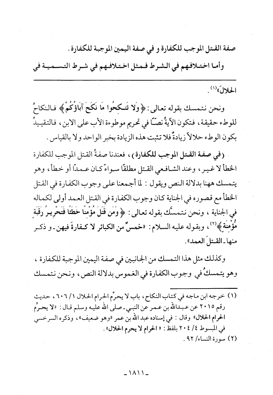 (في صفة القتل الموجب للكفارة)، فعندنا صفة القتل الموجب للكفارة الخطأ لا غير، وعند الشافعي القتل مطلقا سواء كان عمدا أو خطأ، وهو يتمسك ههنا بدلالة النص ويقول: لما أجمعنا بوجوب الكفارة في القتل الخطأ مع قصوره في الجناية كان وجوب الكفارة في القتل العمد أولى لكماله في الجناية، ونحن نتمسك بقوله تعالى: (وَمَنْ قَتَلَ مُؤْمِنًا خَطًَا فَتَحْرِيرُ رَقَبَةٍ مُؤْمِنَةٍ)، وبقوله عليه السلام: ((خمس من الكبائر لا كفارة فيهن -وذكر منها- القتل العمد)).