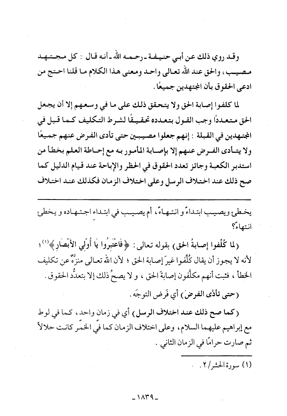 (لما كلفوا إصابة الحق) بقوله تعالى: (فَاعْتَبِرُوا يَا أُوْلِي الأَبْصَارِ)، لأنه لا يجوز أن يقال كلفوا غير إصابة الحق؛ لأن الله تعالى منزه عن تكليف الخطأ، فثبت أنهم مكلفون إصابة الحق، ولايصح ذلك إلا بتعدد الحقوق.