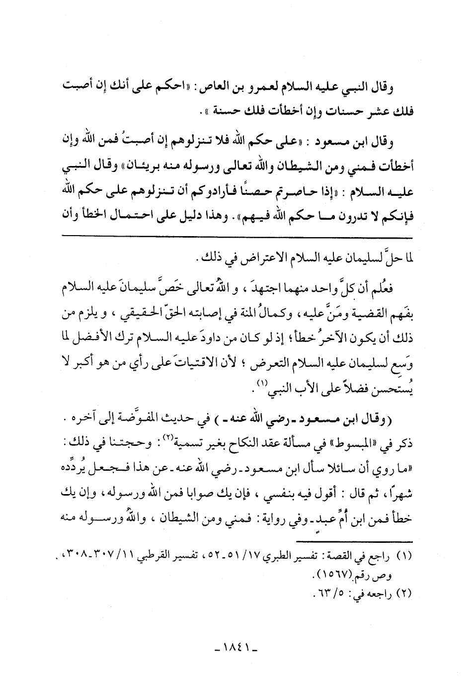 فعلم أن كل واحد منهما اجتهد، والله تعالى خص سليمان عليه السلام بفهم القضية ومن عليه، وكمال المنة في إصابته الحق الحقيقي، ويلزم من ذلك أن يكون الآخر خطأ؛ إذ لو كان من داود عليه السلام ترك الأفضل لما وسع لسليمان عليه السلام التعرض؛ لأن الاقتيات على رأي من هو أكبر لا يستحسن فضلًا على الأب النبي.