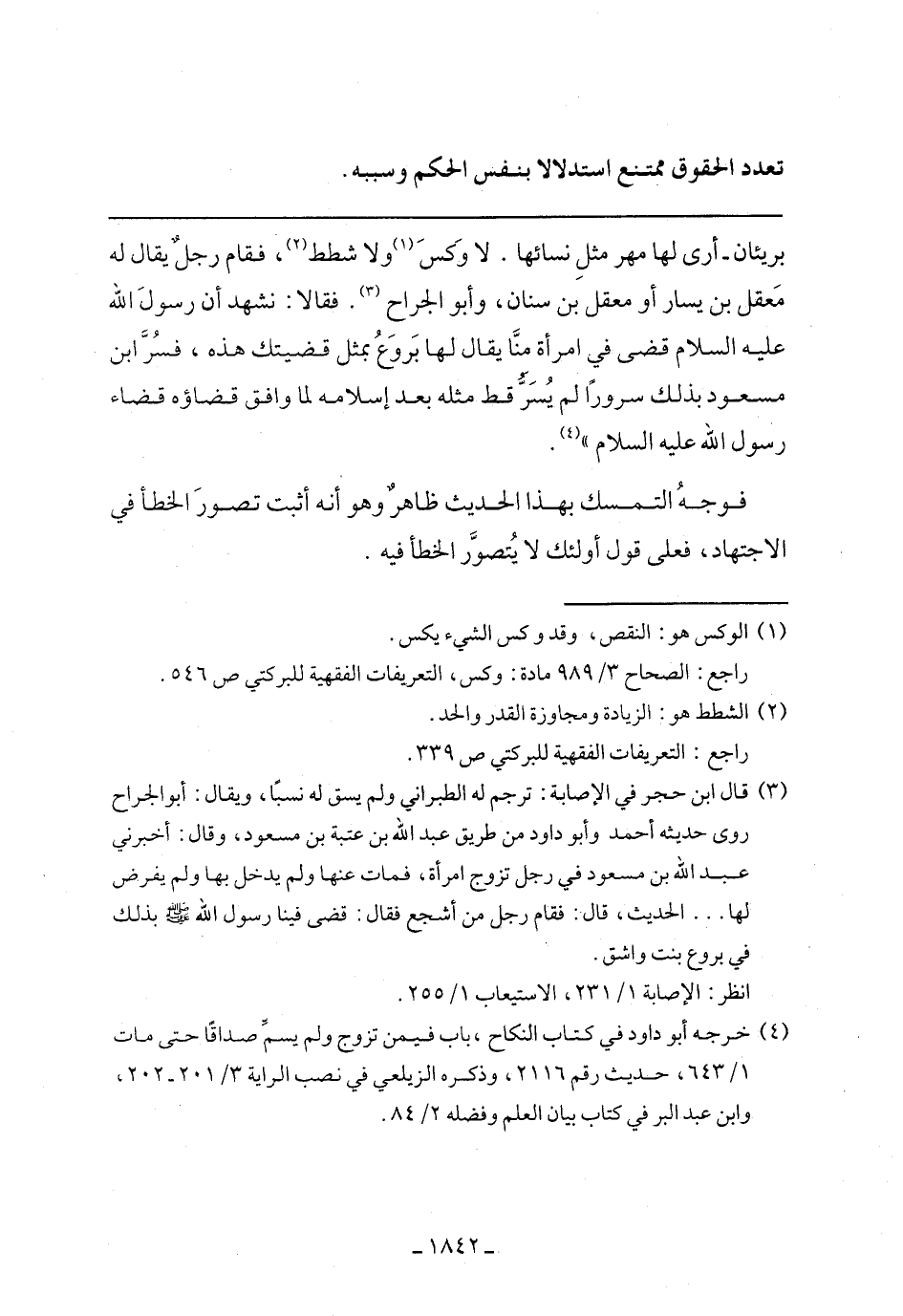 بريئان -أرى لها مهر مثل نسائها. لا وكس ولا شطط، فقام رجل يقال له معقل بن يسار أو معقل بن سنان، وأبو الجراح. فقالا: نشهد أن رسول الله عليه السلام قضى في امرأة منا يقال لها بروع بمثل قضيتك هذه، فسر ابن مسعود بذلك سرورًا لم يسر قط مثله بعد إسلامه لما وافق قضاؤه قضاء رسول الله عليه السلام".