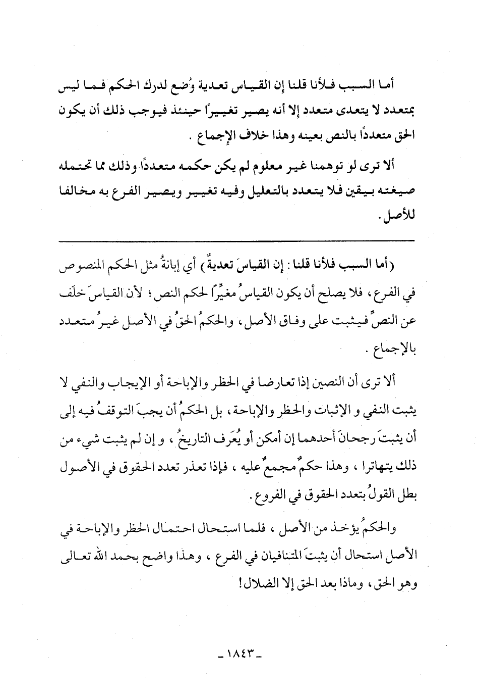 والحكم يؤخذ من الأصل، فلما استحال احتمال الحظر والإباحة في الأصل استحال أن يثبت المتنافيان في الفرع، وهذا واضح بحمد الله تعالى وهو الحق، وماذا بعد الحق إلا الضلال!