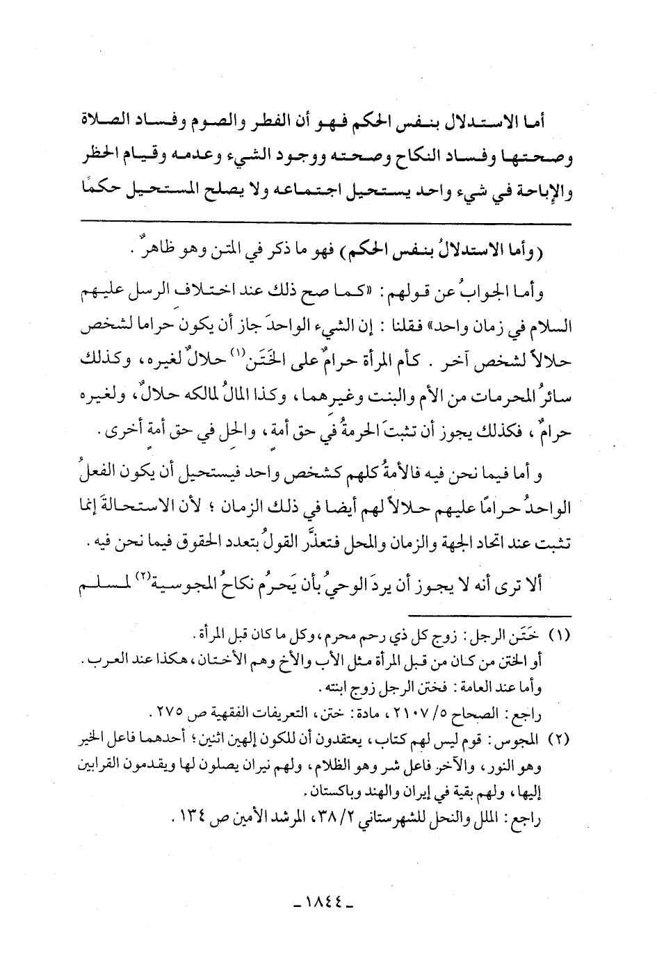 وأما الجواب عن قولهم: "كما صح ذلك عند اختلاف الرسل عليهم السلام في زمان واحد" فقلنا: إن الشيء الواحد جاز أن يكون حرامًا لشخص حلالًا لشخص آخر. كأم المرأة حرام على الختن حلال لغيره، وكذلك سائر المحرمات من الأم والبنت وغيرهما، وكذا المال لمالكه حلال، ولغيره حرام، فكذلك يجوز أن تثبت الحرمة في حق أمة، والحل في حق أمة أخرى.