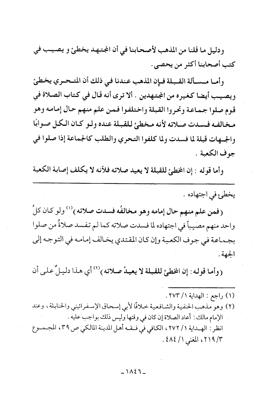 (فمن علم منهم حال إمامه وهو مخالفه فسدت صلاته) ولو كان كل واحد منهم مصيبًا في اجتهاده لما فسدت صلاته كما لم تفسد صلاة من صلوا بجماعة في جوف الكعبة وإن كان المقتدي يخالف إمامه في التوجه إلى الجهة.