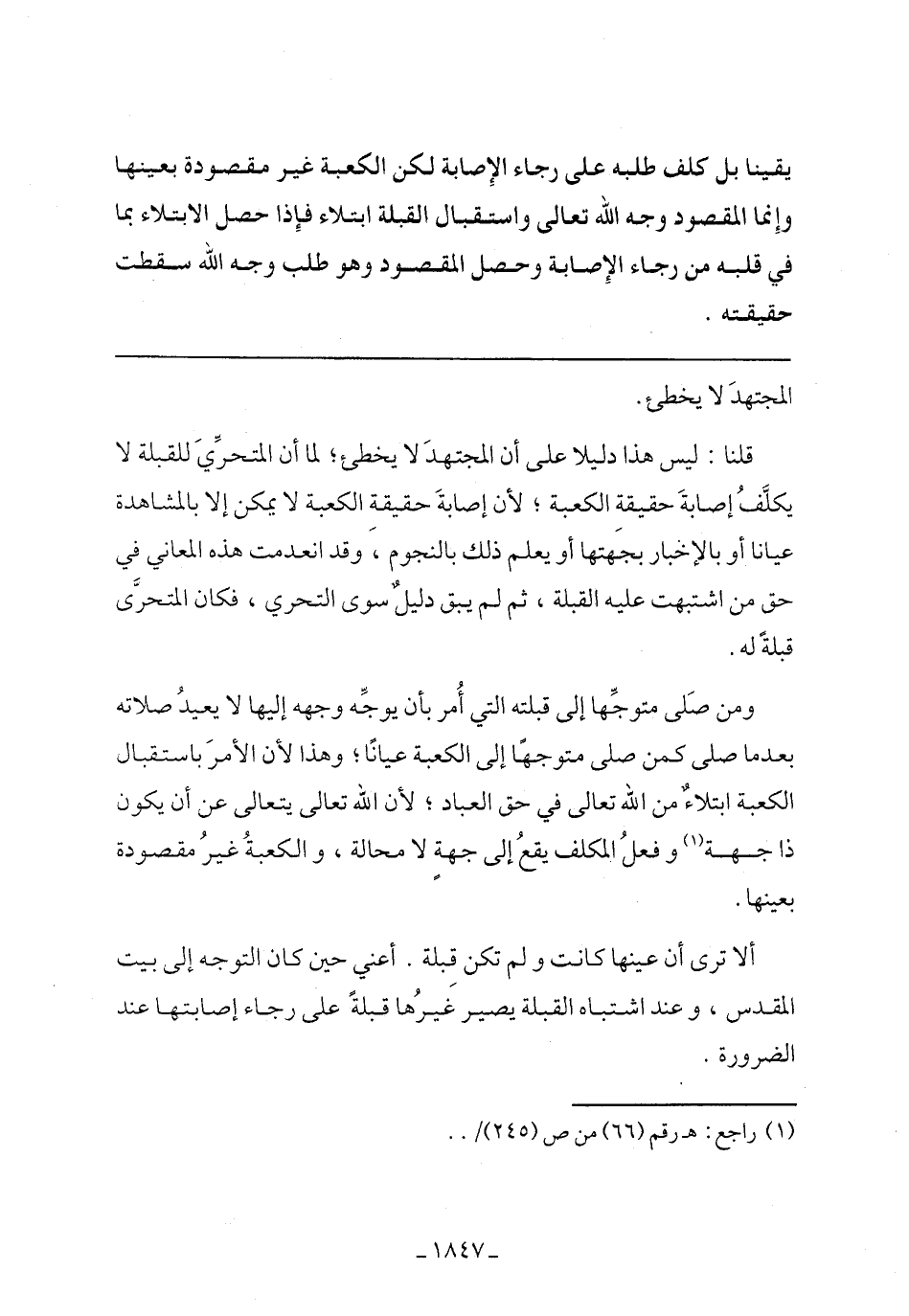 قلنا: ليس هذا دليلا على أن المجتهد لا يخطئ؛ لما أن المتحرى للقبلة لا يكلف إصابة حقيقة الكعبة؛ لأن إصابة حقيقة الكعبة لا يمكن إلا بالمشاهدة عيانًا أو بالإخبار جهتها أو يعلم ذلك بالنجوم، وقد انعدمت هذه المعاني في حق من اشتبهت عليه القبلة، ثم لم يبق دليل سوى التحرى، فكان المتحري قبلة له.