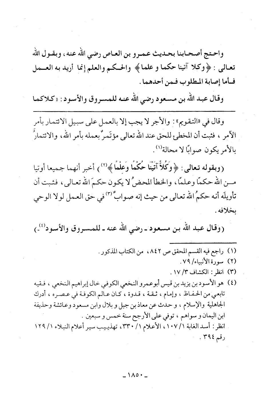 (وبقوله تعالى: (وكُلًا آتَيْنَا حُكْمًا وعِلْمًا) أخبر أنهما جميعًا أوتيا من الله حكمًا وعلمًا، والخطأ المحض لا يكون حكم الله تعالى، فثبت أن تأويله أنه حكم الله تعالى من حيث إنه صواب في حق العمل لولا الوحي بخلافه.
