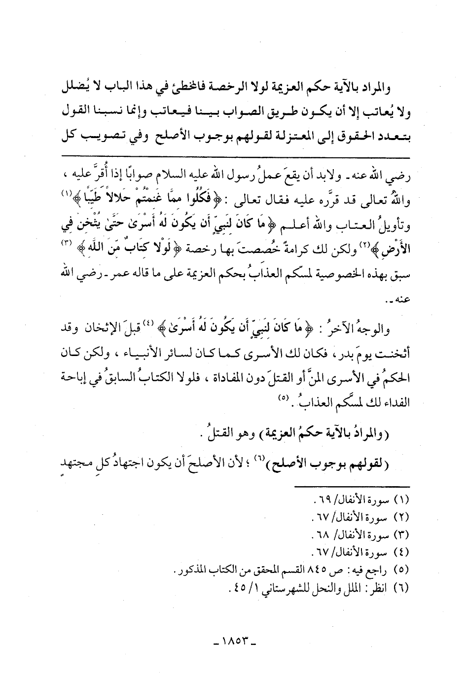 رضي الله عنه ولا بد أن يقع عمل رسول الله عليه السلام صوابا إذا أقر عليه، والله تعالى قد قرره عليه فقال تعالى (فَكُلُوا مِمَّا غَنِمْتُمْ حَلالًا طَيِّبًا) وتأويل العتاب والله أعلم (مَا كَانَ لِنَبِيٍّ أَن يَكُونَ لَهُ أَسْرَى حَتَّى يُثْخِنَ فِي الأَرْضِ) ولكن لك كرامة خصصت بها رخصة (لَوْلا كِتَابٌ مِّنَ اللَّهِ)