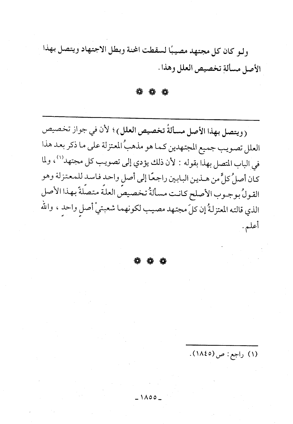 (ويتصل بهذا الأصل مسألة تخصيص العلل)؛ لأن في جواز تخصيص العلل تصويب جميع المحتهدين كما هو مذهب المعتزلة على ما ذكر بعد هذا في الباب المتصل بهذا بقوله: لأن ذلك يؤدي الي تصويب كل مجتهد، ولما كان أصل كل من هذين البابين راجعا إلى أصل واحد فاسد للمعتزلة وهو القول بوجوب الأصلح كانت مسألة تخصيص العلة متصلة بهذا الأصل الذي قالته المعتزلة أن كل مجتهد مصيب لكونهما شعبتي أصل واحد، والله أعلم.