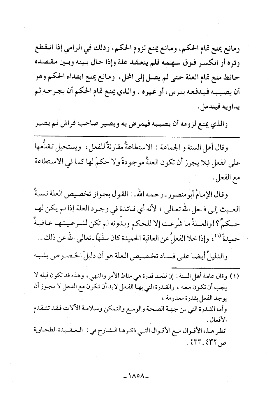 وقال أهل السنة والجماعة: الاستطاعة مقارنة للفعل، ويستحيل تقدمها على الفعل فلا يجوز أن تكون العلة موجودة ولا حكم لها كما في الاستطاعة مع الفعل.
