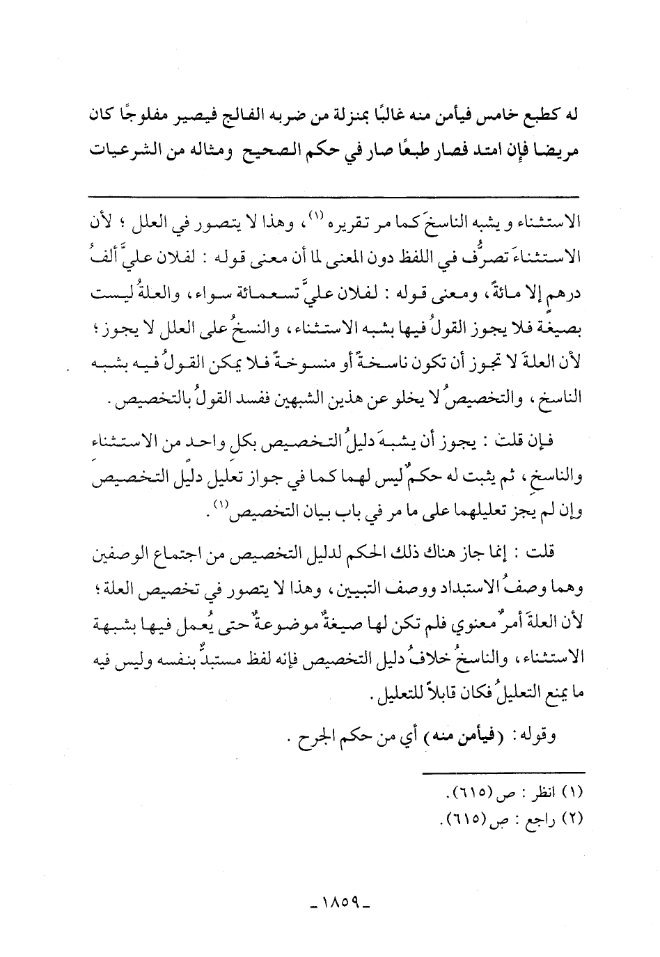 قلت: إنما جاز هناك ذلك الحكم ل دليل التخصص من اجتماع الوصفين وهما وصف الاستبدال ووصف التبيين، وهذا لا يتصور في تخصيص العلة، لأن العلة أم معنوي فلم تكن لها صيغة موضوعة حتى يعمل فيها بشبهة الاستثناء، والناسخ خلاف دليل التخصيص فإنه لفظ مستبد بنفسه وليس فيه ما يمنع التعليل فكان قابلًا للتعليل.